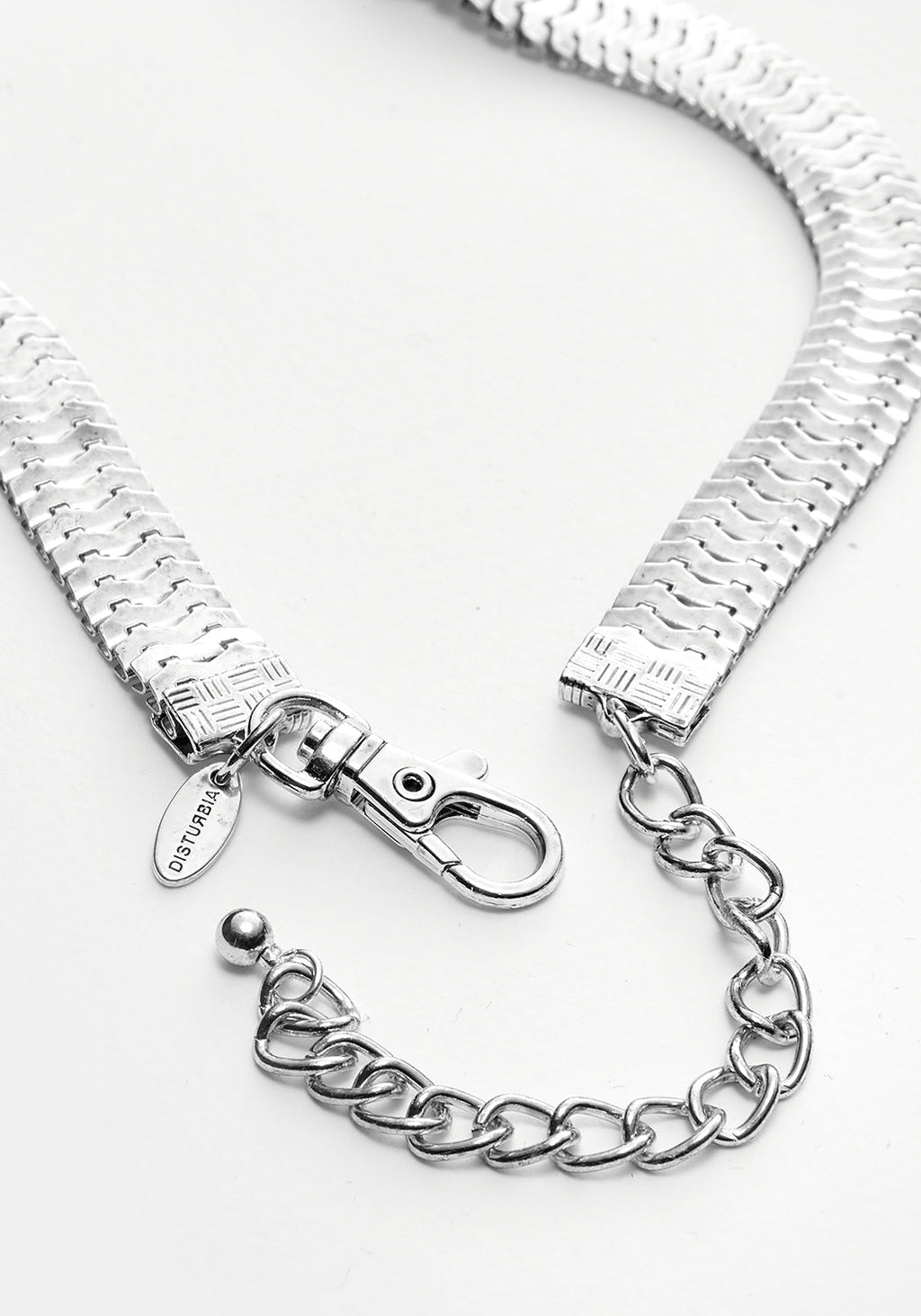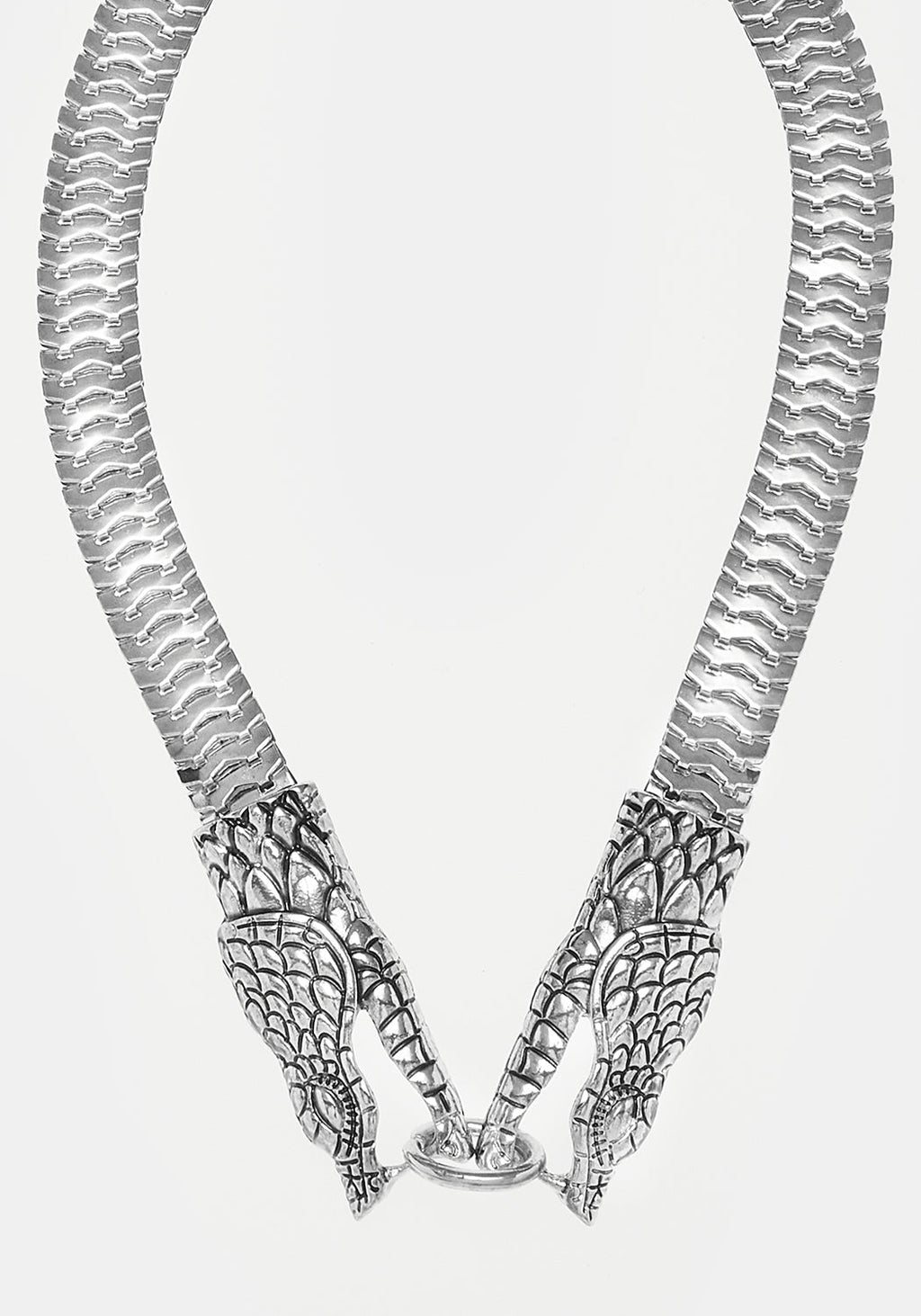 Why yes, it is a double-headed snake choker with zoomorphic terminals throwing way back to 6th century BC. Serpent worship has empowered & enlightened nearly every ancient culture - we like to think this choker gives us the power to express our voice, even if it shakes. You're protected by two serpent heads, which sit at the front of your neck clutching an O-ring link before slinking round in a wide silver snake chain. It fastens with a swivel lobster-claw clasp and surplus chain, so you can wear as tight or loose as you like. Try it as a stand-out companion to daintier necklaces and a leather jacket.
