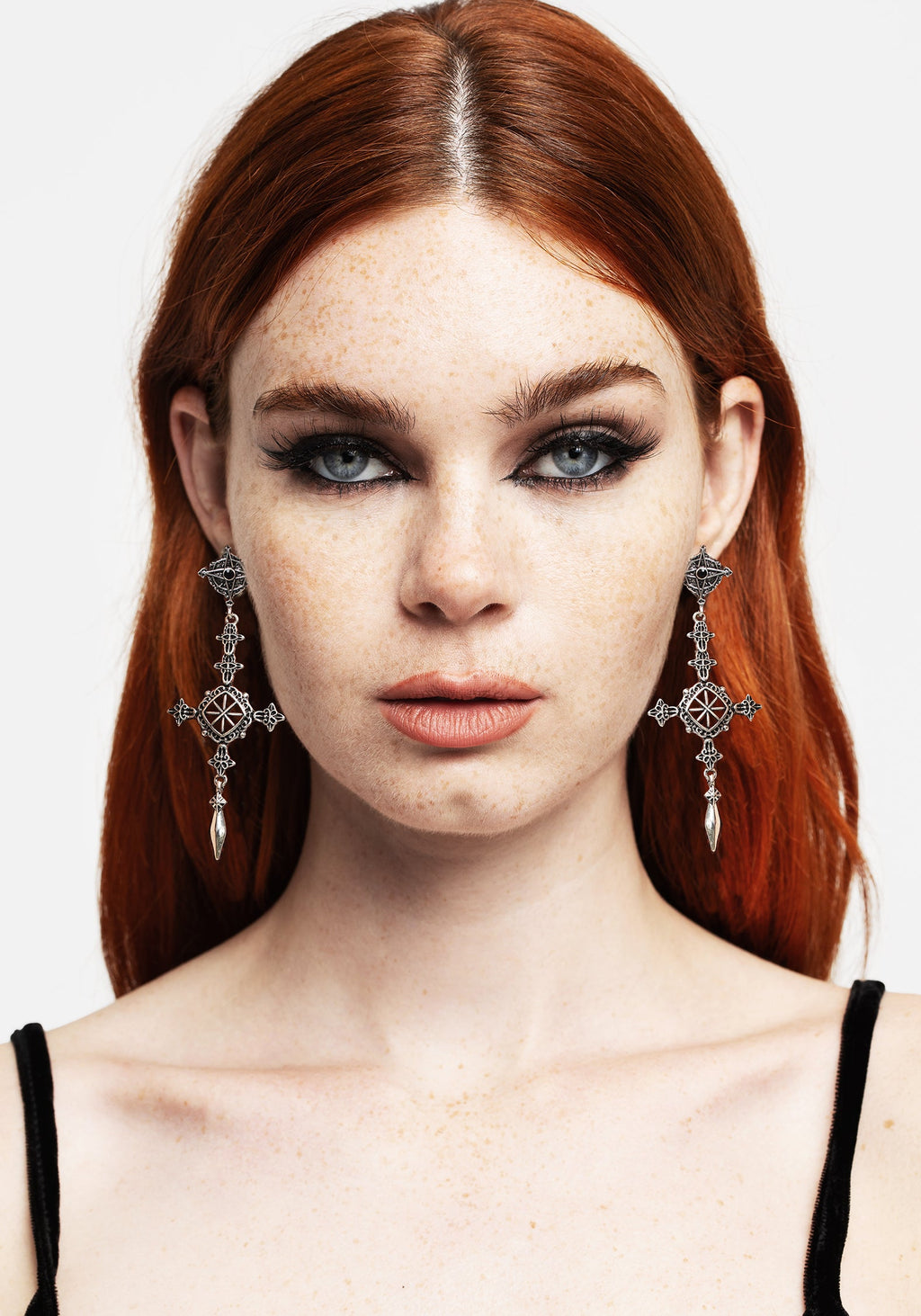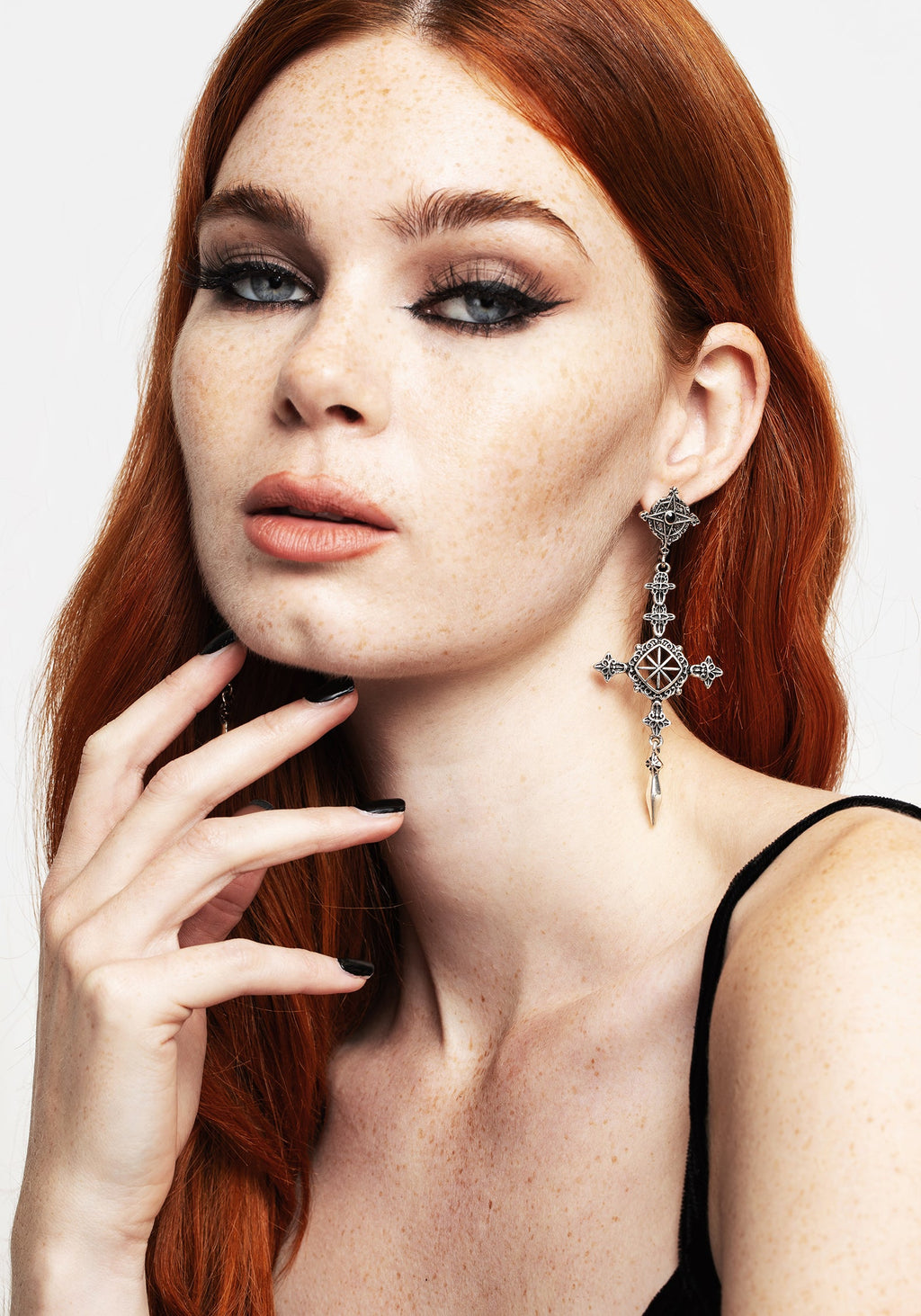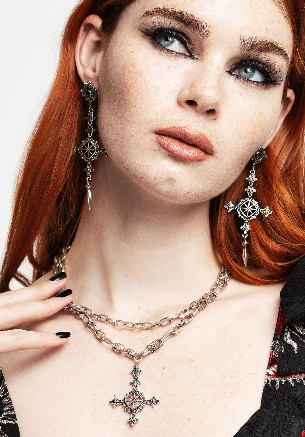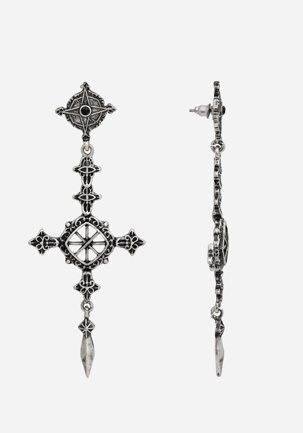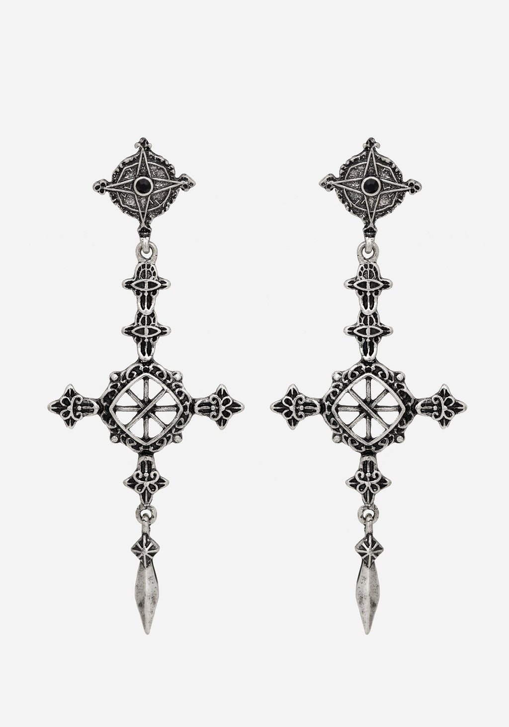 Classic cross drop earrings, with a twist! An ornate inverted cross is suspended from a compass rose embellished with a black gem. A simple concept, elevated for everyday wear.