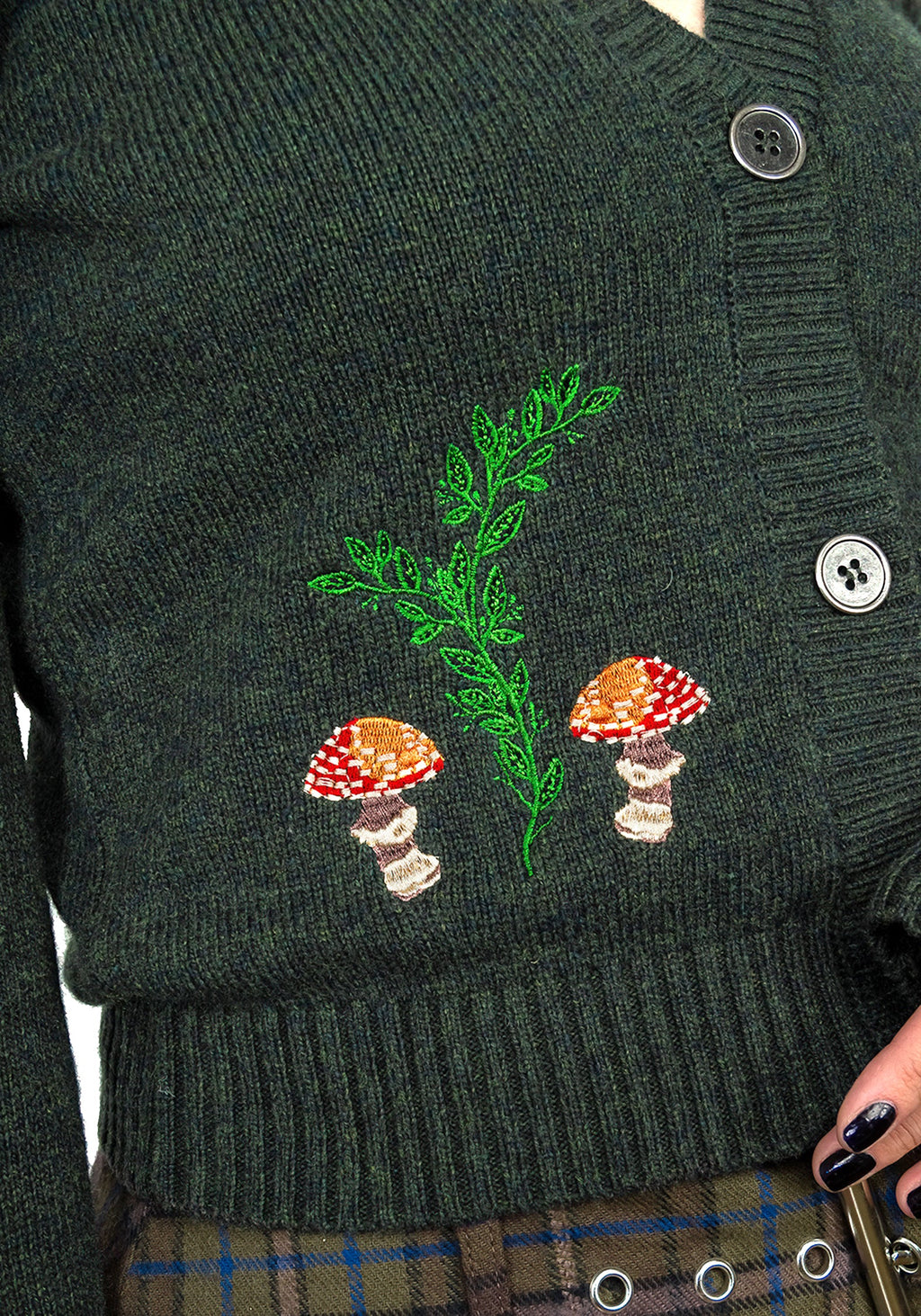 - Soft green knit with faery mushroom embroidery on front and sleeves