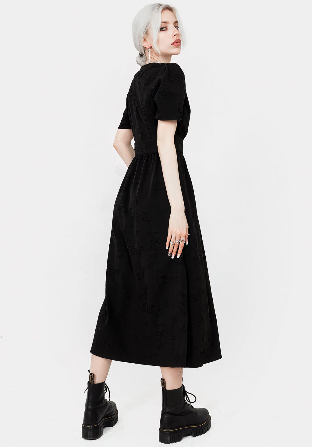 - Crinkle crepe-like black fabrication with textured floral jacquard design