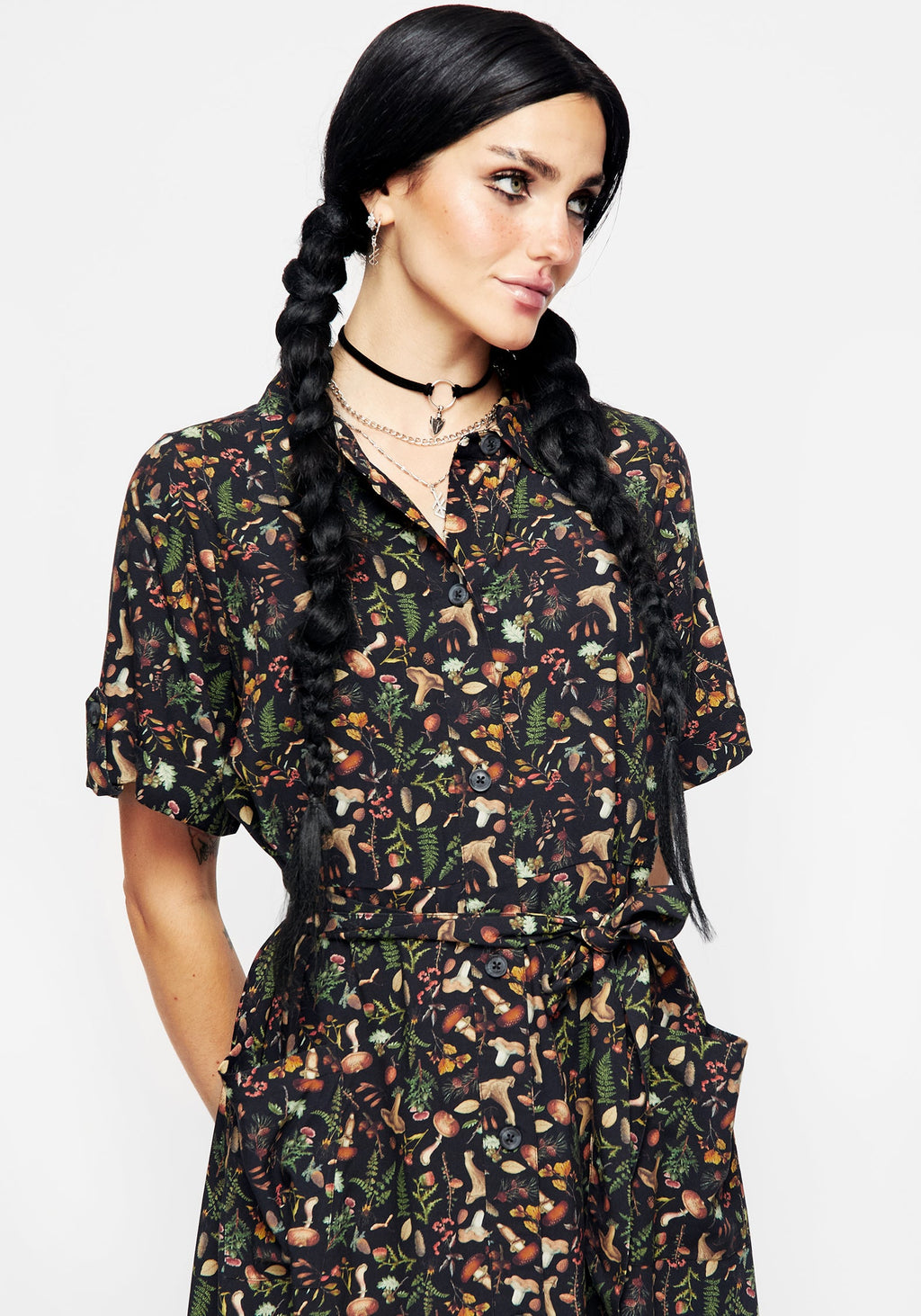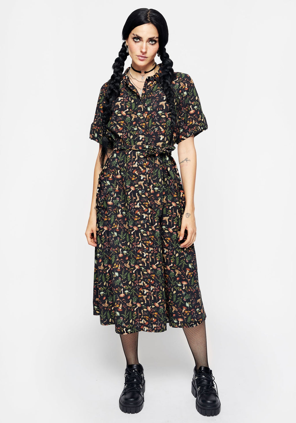 - Black mushroom print short sleeve midi shirt dress