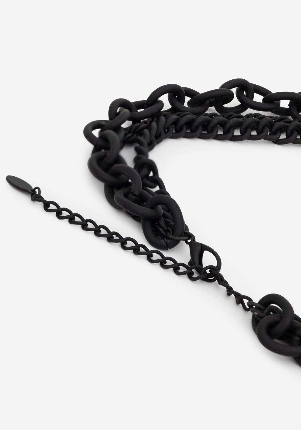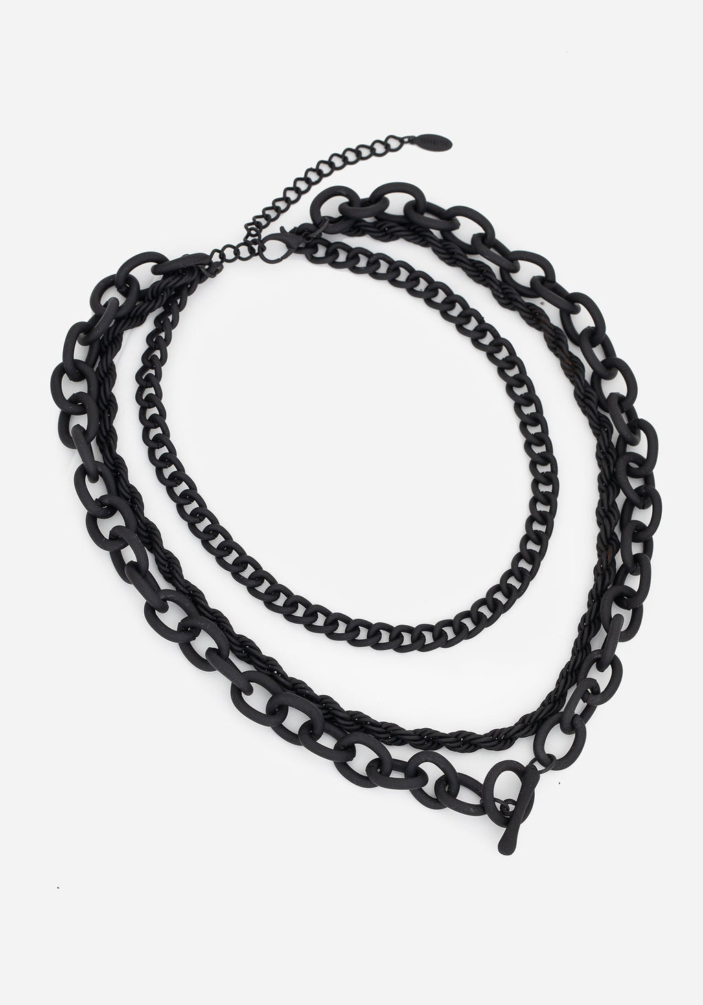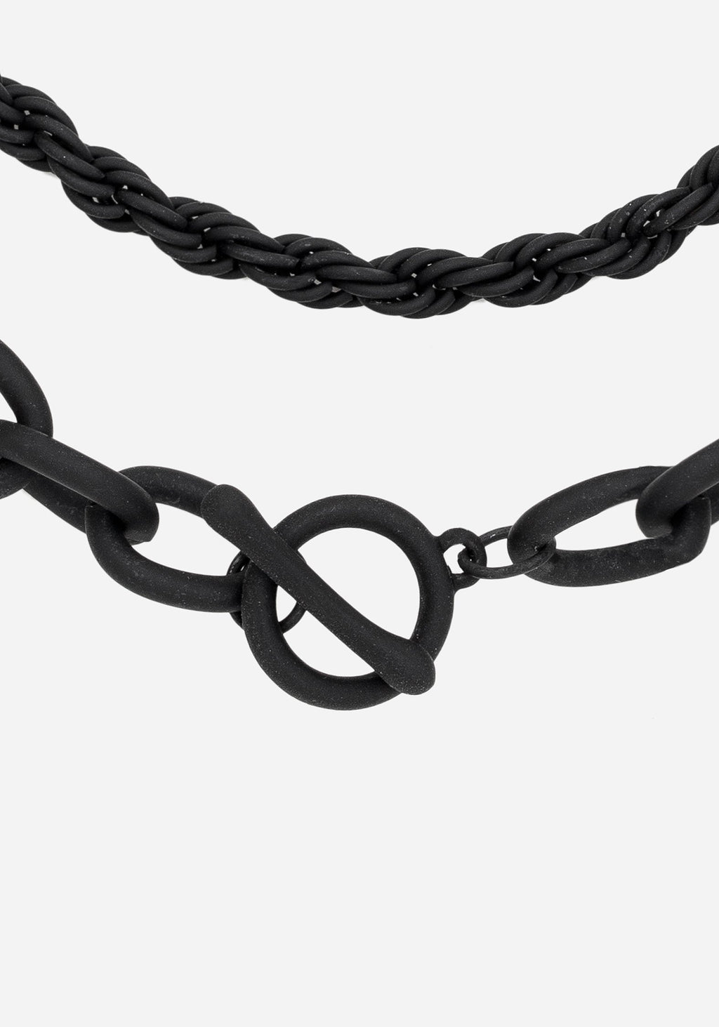 Finally, a layered chain necklace that fits with your all-black aesthetic! Featuring one curb, one rope, & one chunky link chain with a decorative toggle closure, this necklace pairs perfectly with your alt outfits on those days when you just wanna feel casual. With a rubberised matte black coating, this jewellery is your new favourite understated accessory.