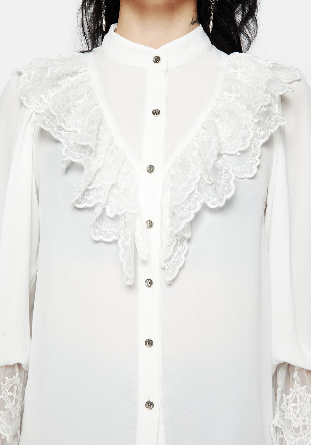 - High choker collar & long blouson sleeves with flared lace cuffs