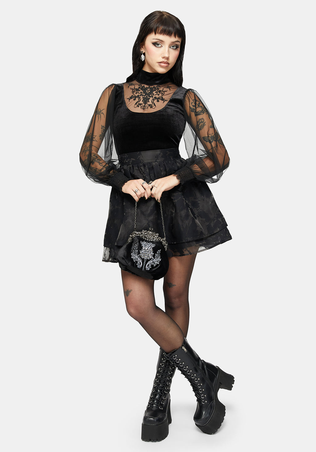 • Black Velvet & Mesh Embroidered Top