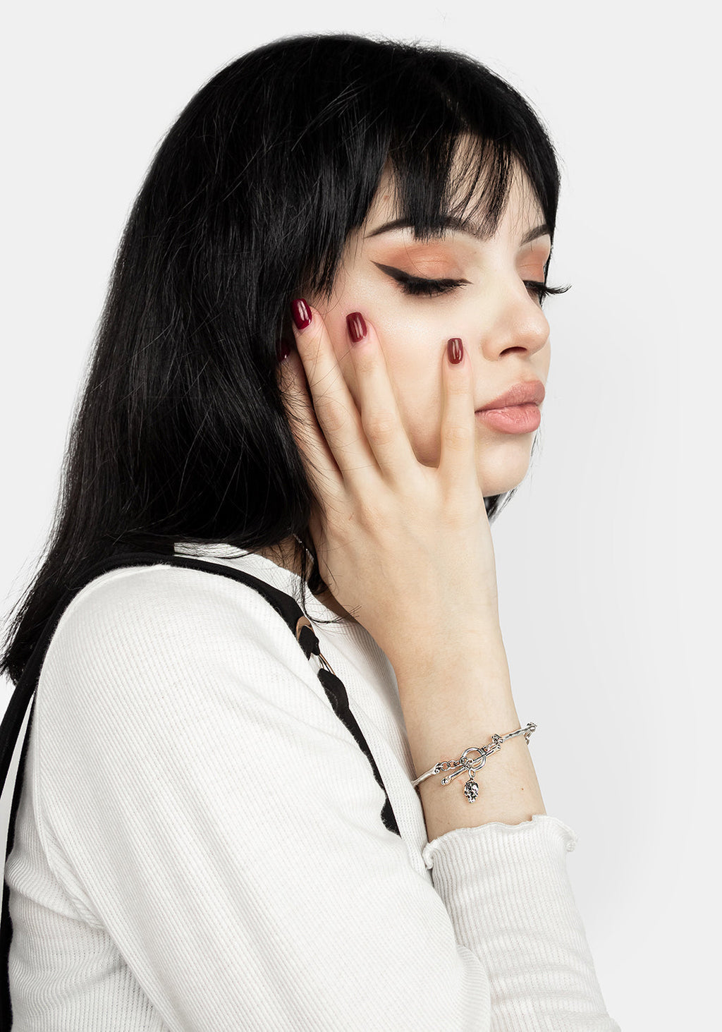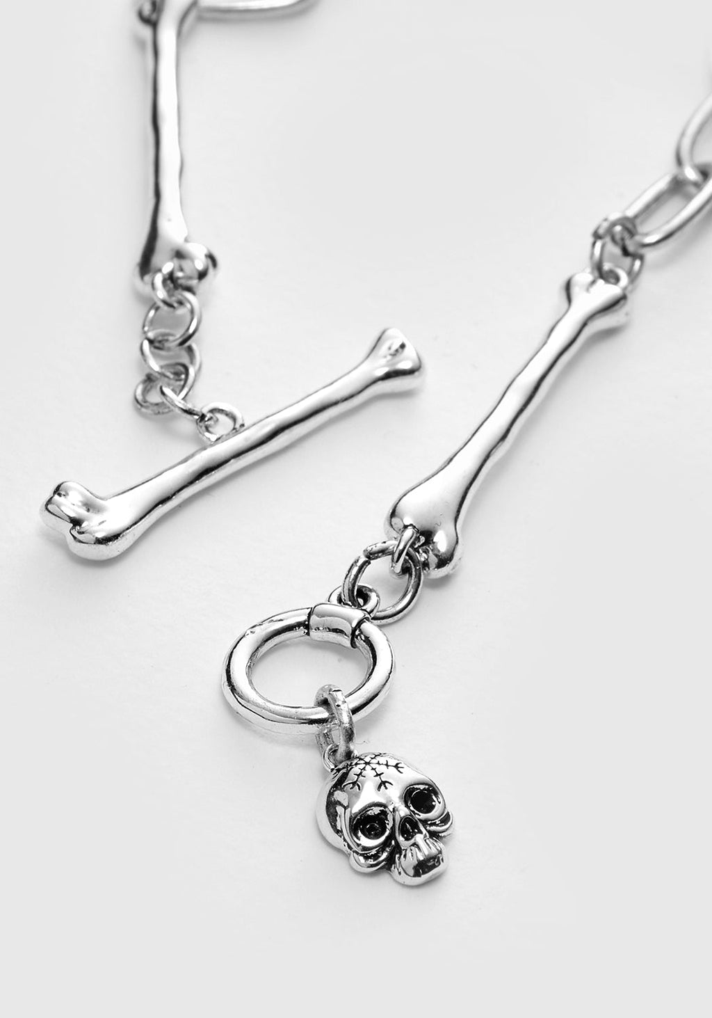 Behold! This silver-plated bone bracelet is accented by a realistic skull head charm, engraved with a magick symbol and finished with tiny black agate eyes that delve deep into the souls of your enemies and rip them to shreds. Sitting comfortably on the wrist, it has an asymmetric chain made up of gleaming bones on one half and elongated links on the other. Enjoy the off-kilter aesthetic and fantastical fastening - a dreamy silver bone-shaped T-bar.