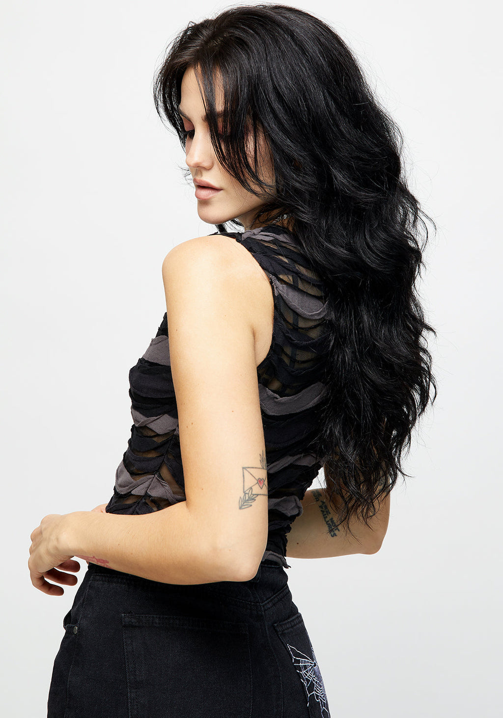 - Dimensional black and mushroom grey jersey strips overlay sheer mesh