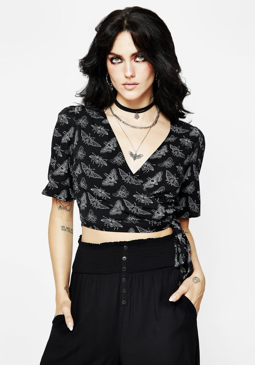 - Wrap-over V-neckline (adjust via self-fabric tie at waist)