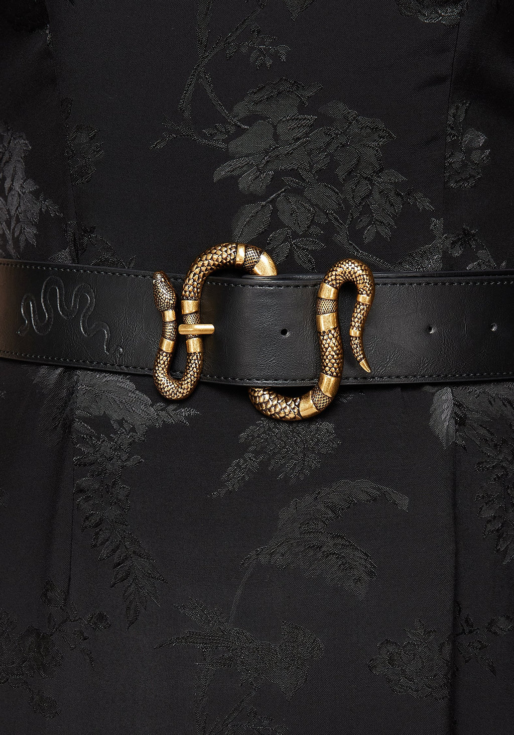 - Black faux leather debossed jeans belt with brass snake buckle