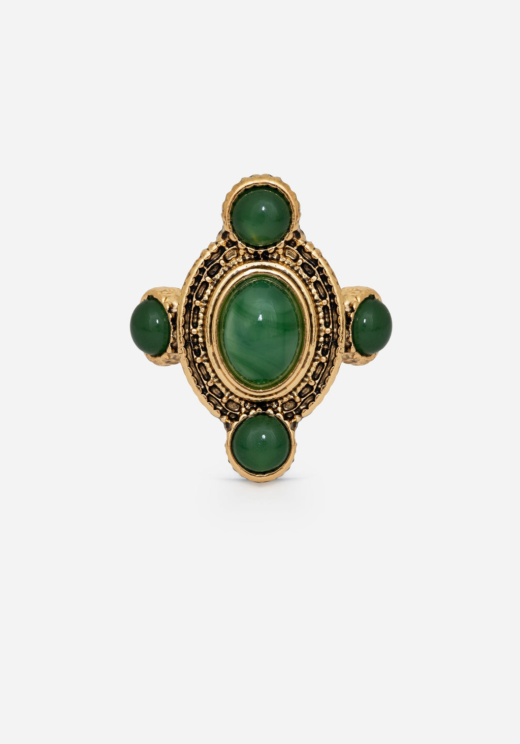 A verdant gold-plated halo ring with an oval setting & finished with glistening green gems.
