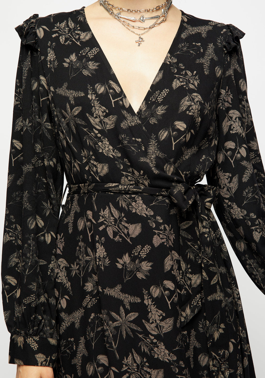 - Faux wrap front secured with stitching and a self-fabric belt to cinch waist