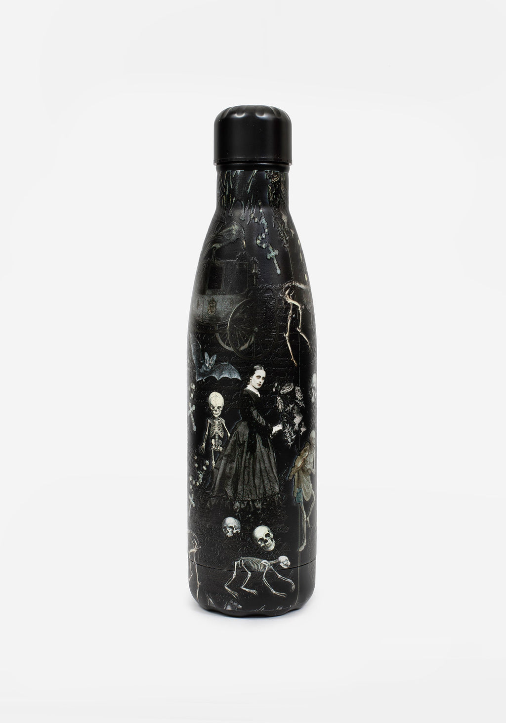 - Ghoulish Victorian-inspired skeleton print on a black base
