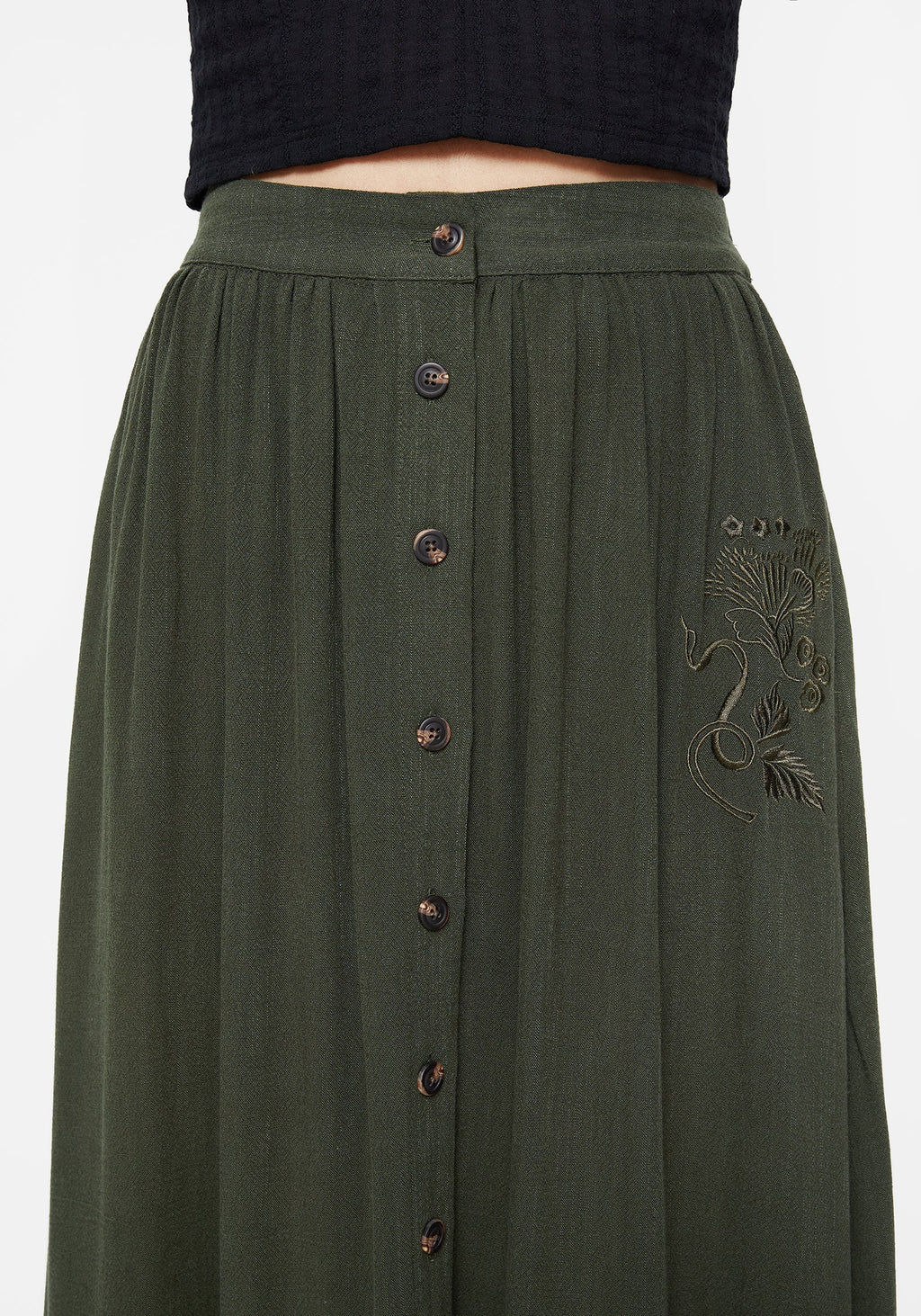 • Green Embroidered Button Up Midaxi Skirt