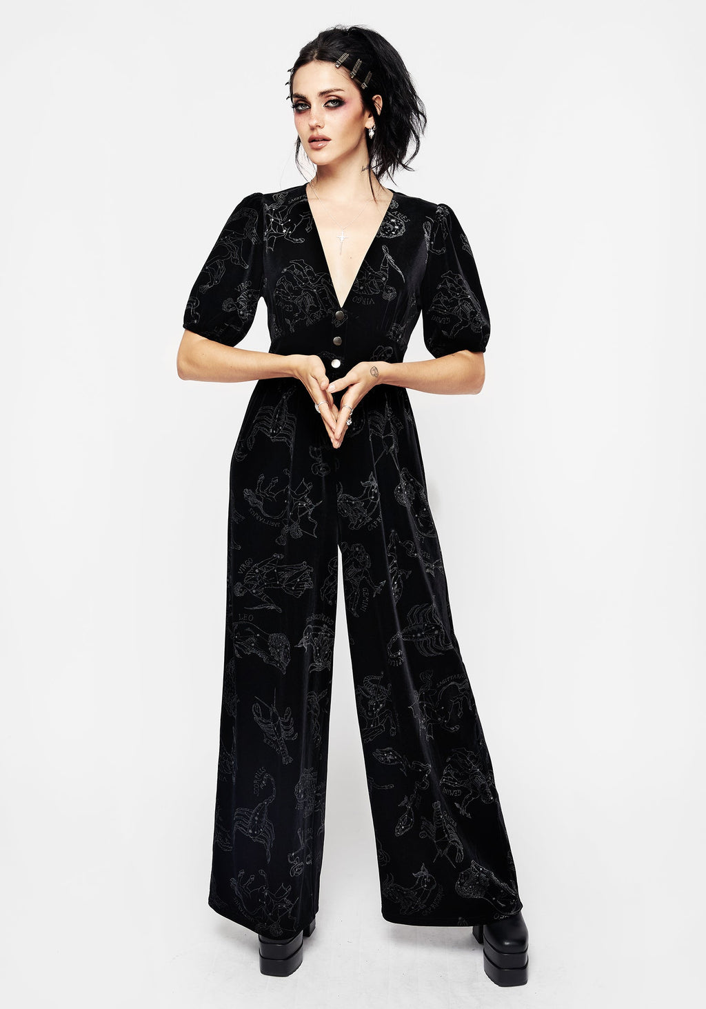 - Sumptuous stretchy black velour fabrication with all-over foiled zodiac print