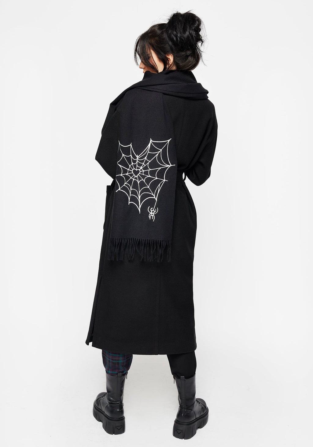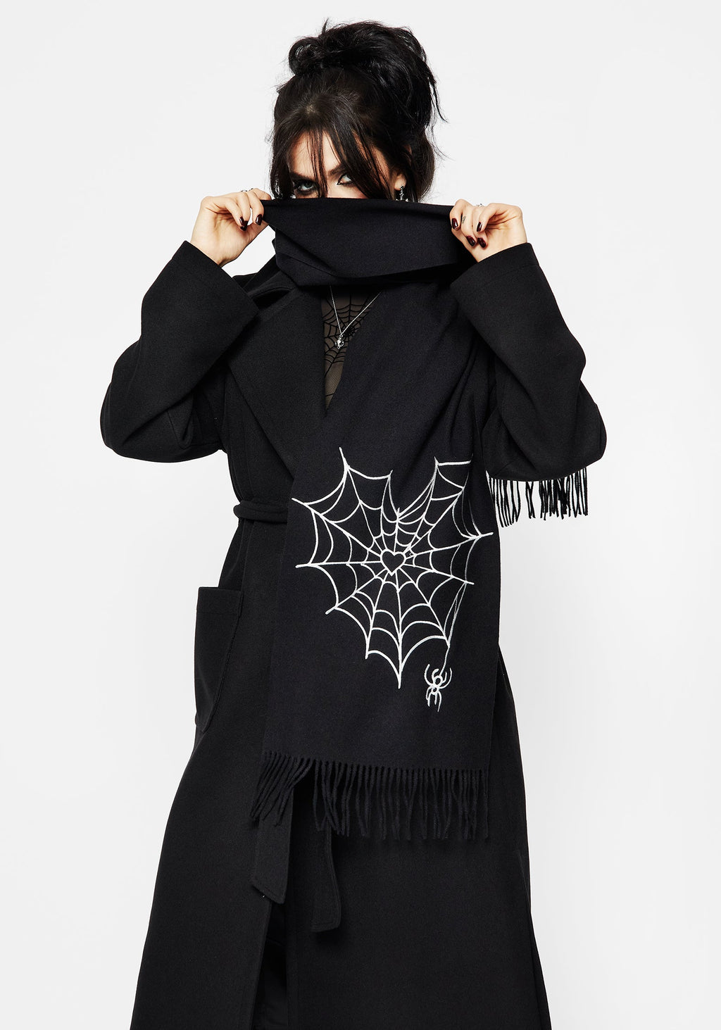- Soft black knit fabrication with contrasting heart-shaped spiderweb embroidery