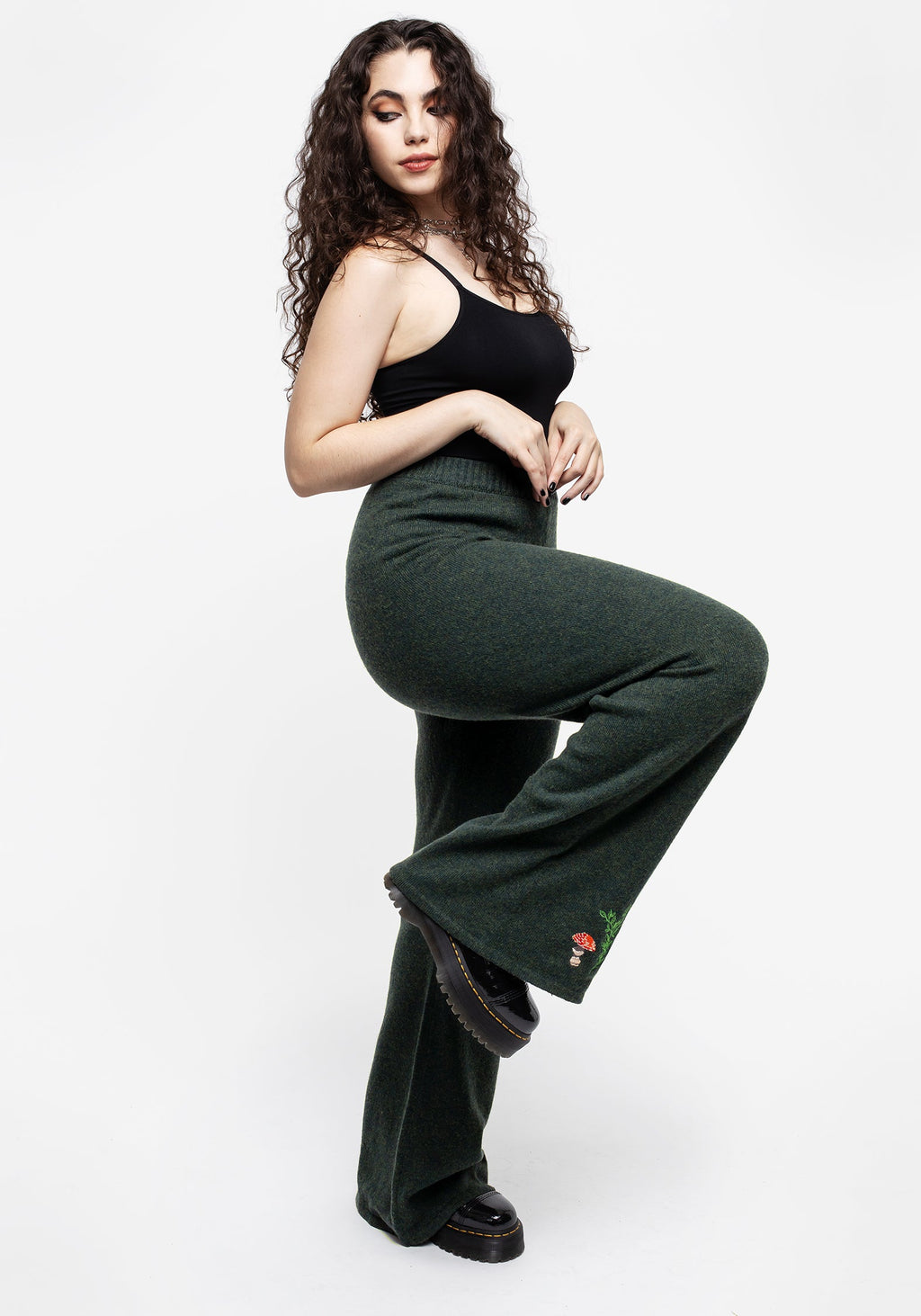 - Green knit mushroom embroidered wide-leg trousers