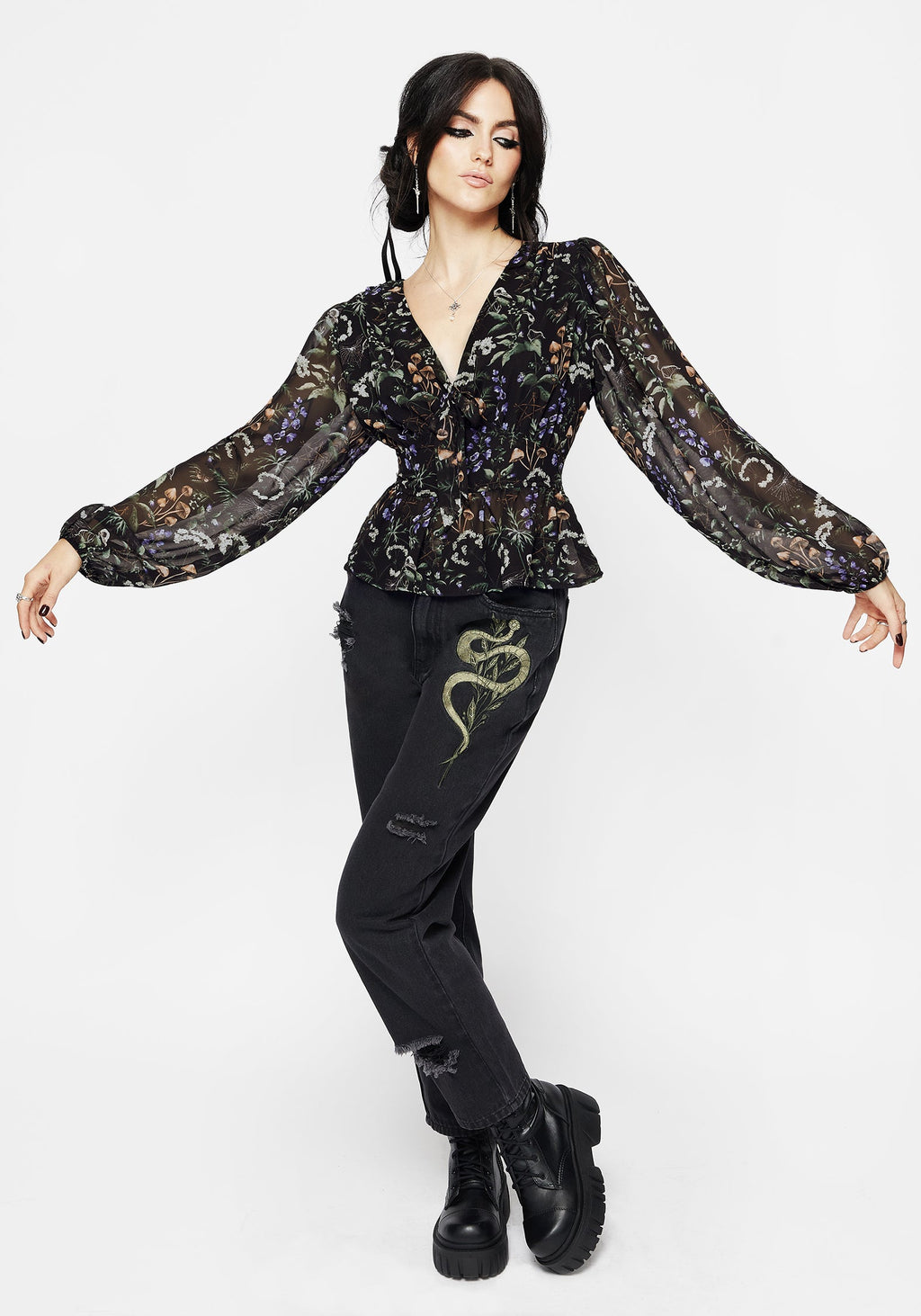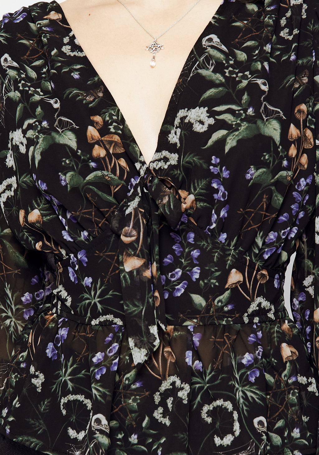 - Wicca-inspired forest print with witchy florals, skeletal creatures & dainty bugs entwined with wooden pentagrams on a black base