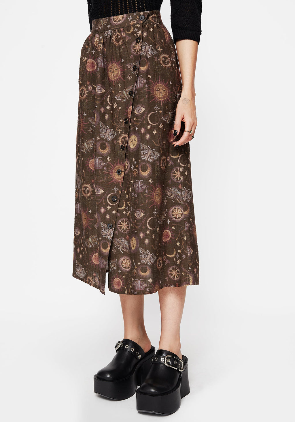 Rhea Cotton Blend Moth and Moon Print Midaxi Skirt