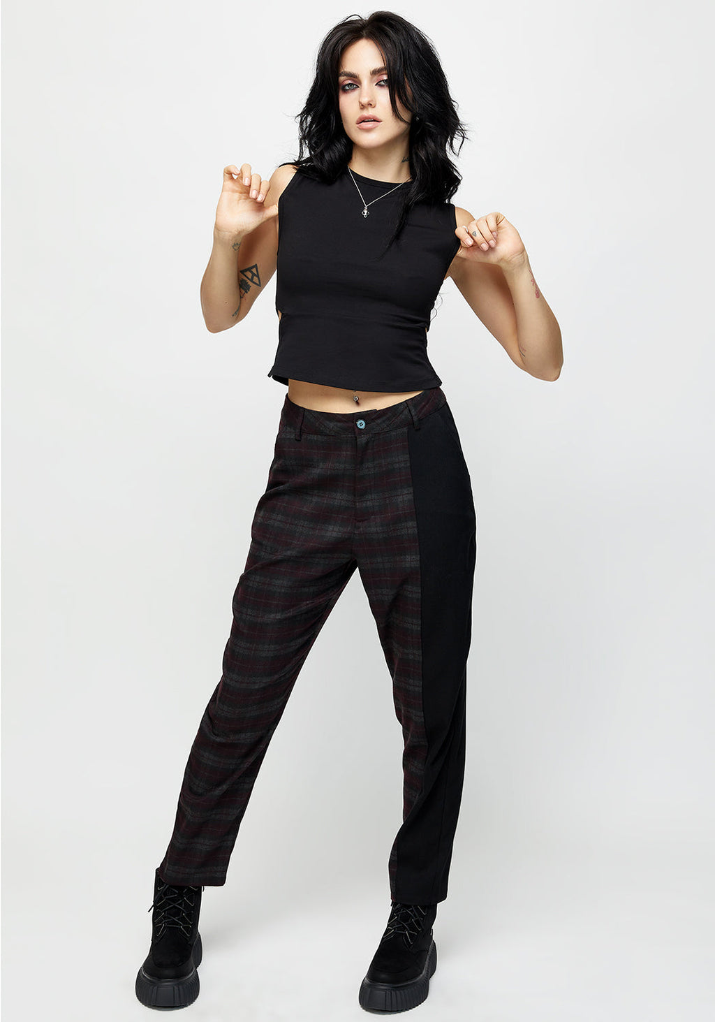 - Soft twill fabric in a black & purple check with solid black contrast panel