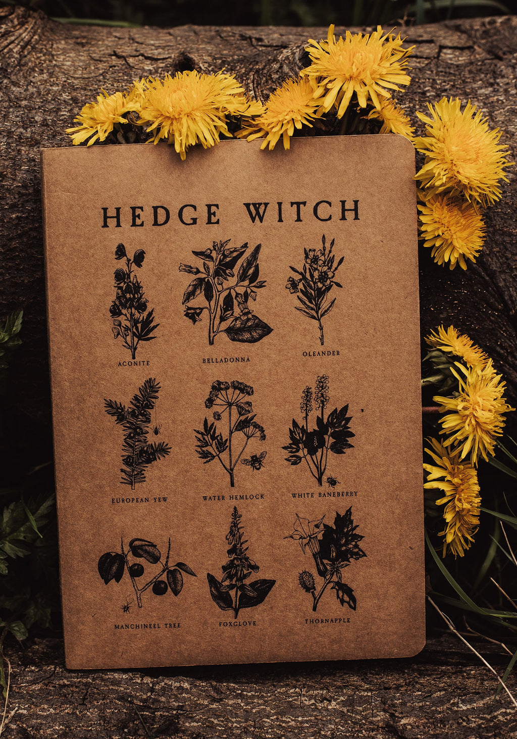- Earthy brown card cover with our black Hedge Witch print on front cover & branded logo on back