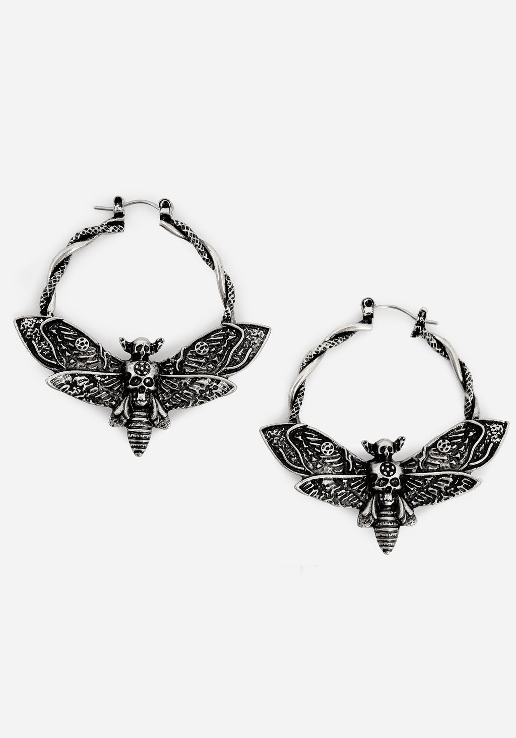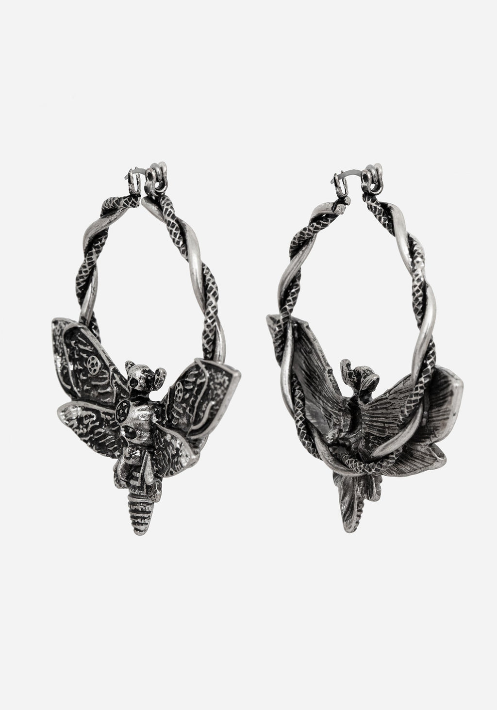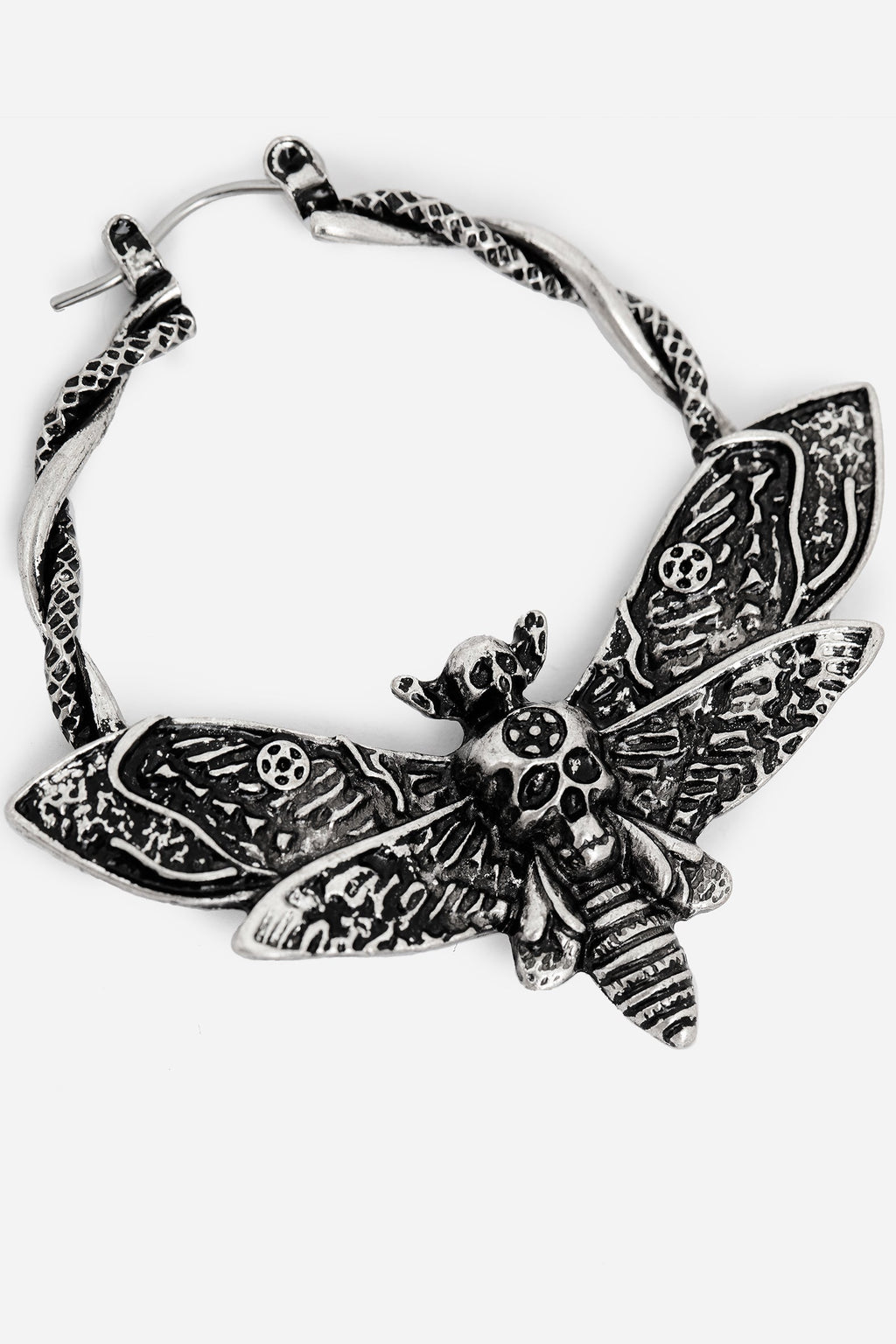A foreboding symbol & harbinger of death to some, a cute aesthetic bug motif to others. We’re on both sides! The intricately moulded death’s head hawkmoth charm hangs from hoop earrings, attached to silver hoops entwined with a rope-look detail. The antique silver plate finish adds dimension to let its features shine!