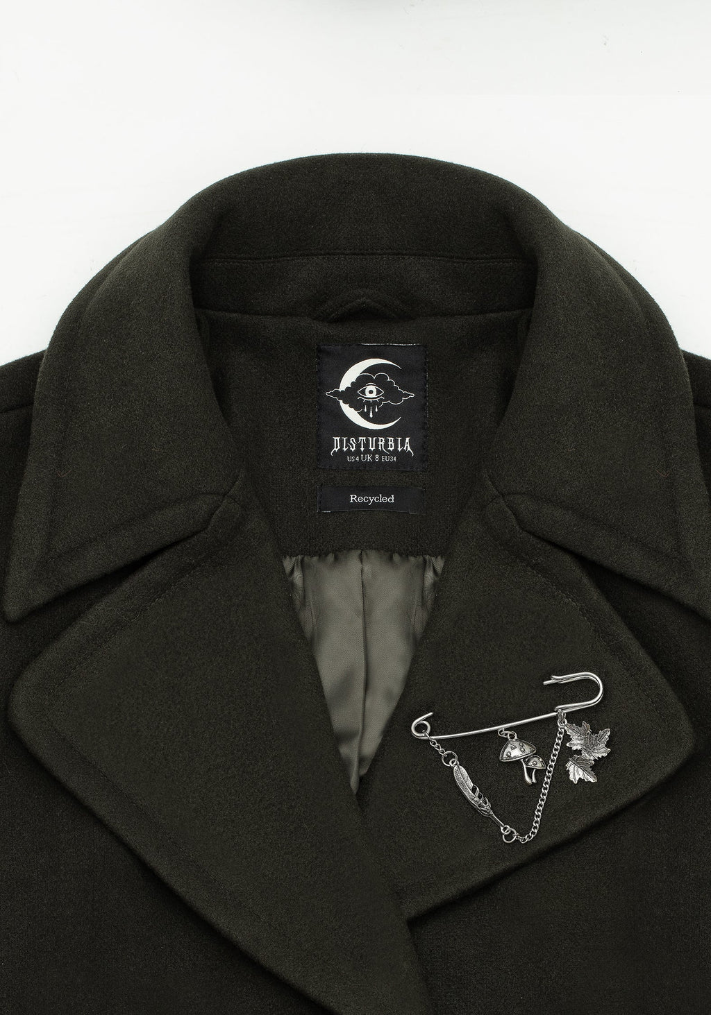- Silver statement safety pin brooch on lapel features mushroom, leaf & feather charms