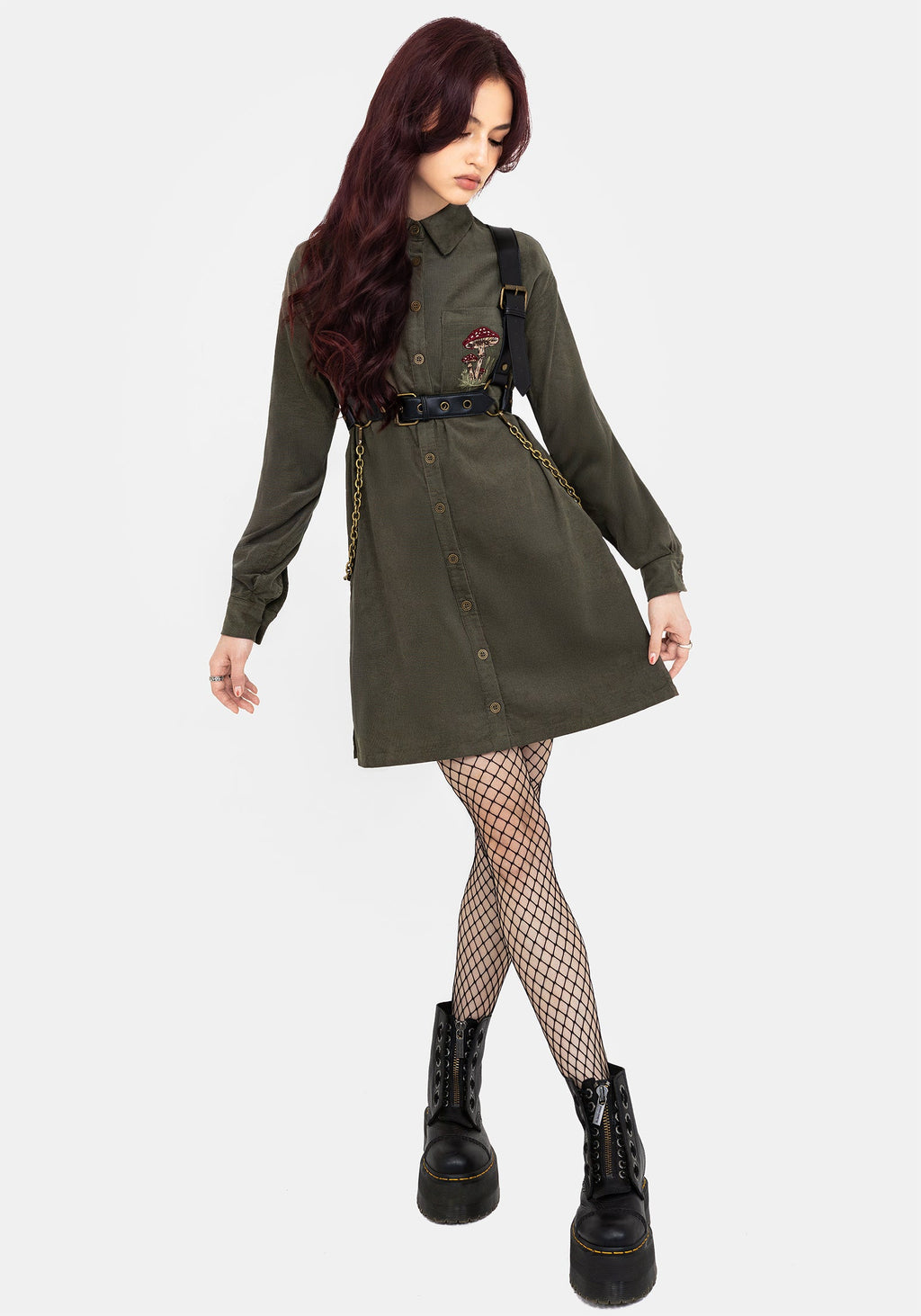 • Green Corduroy Mini Shirt Dress
