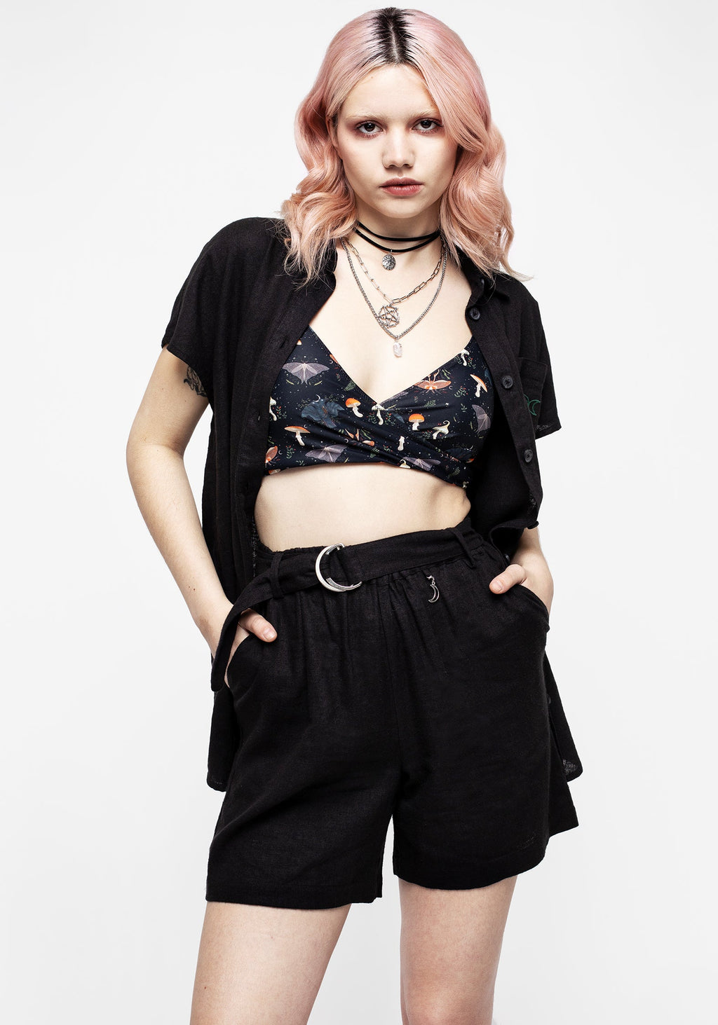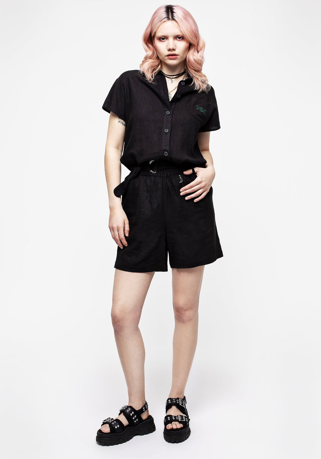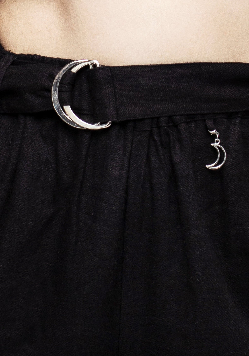 - Black linen-blend relaxed short with silver moon charm