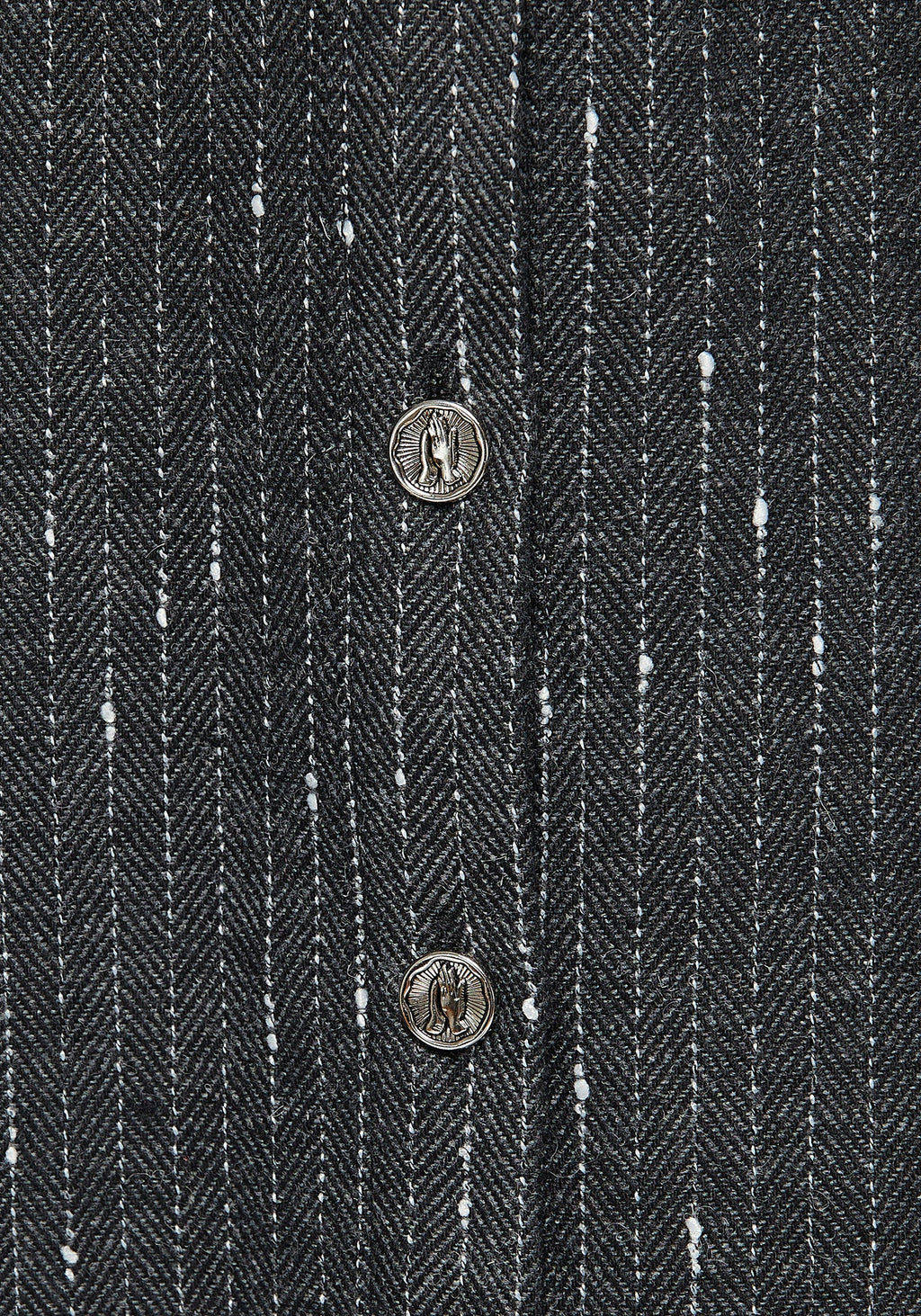 - Wool-blend grey herringbone fabric with white pinstriping