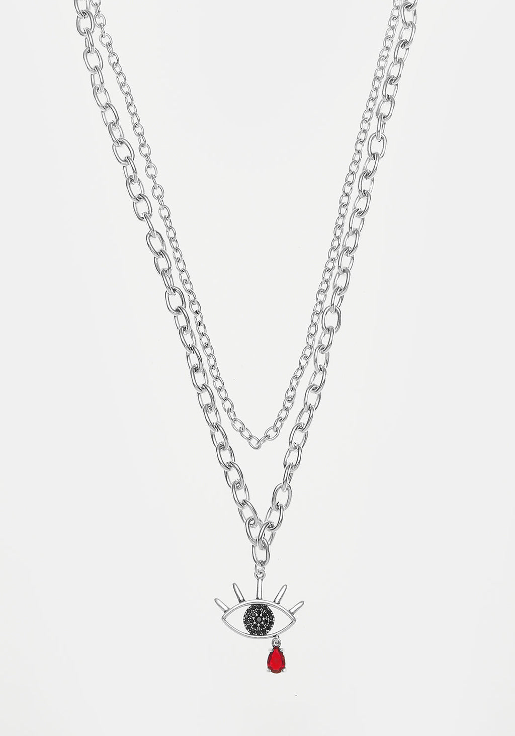 For those willing to look, you'll see a striking ruby tear falling from the eye charm on this chain choker. The cubic zirconia teardrop symbolizes the myth of Mary, weeping blood at the state of the world. Hard relate, right? The eye's pupil is encrusted with tiny jet black gemstones and silver-plated eyelashes. It hangs from a stunning double-layer choker that drapes gracefully around the neck. Plated with real silver, it's designed with thick 'n' thin oval-shaped links and fastens with a lobster clasp. Enjoy how it brings a pop of colour to everyday looks, particularly paired with a rouge lip.