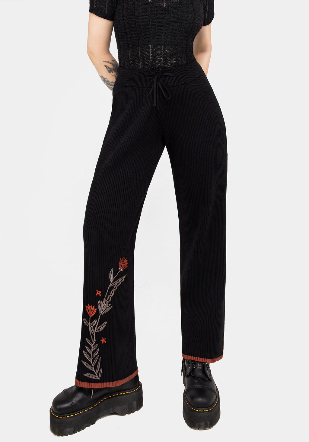 - Black & orange floral embroidered knitted trousers