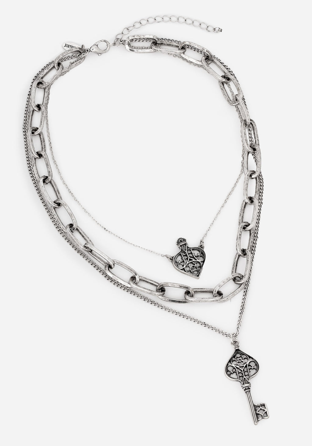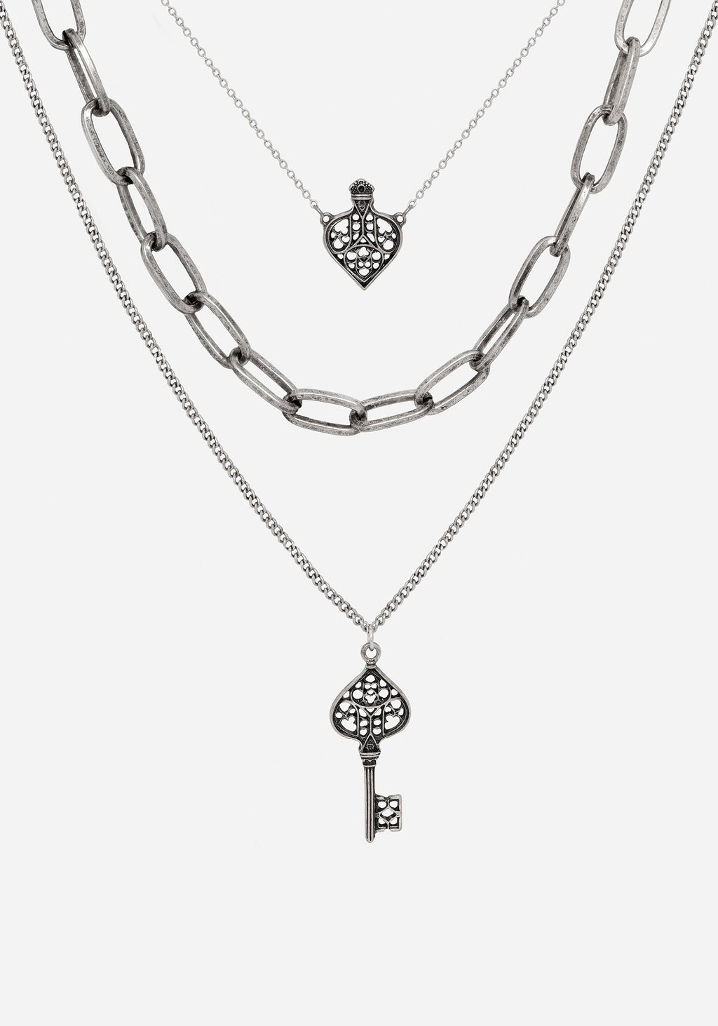 Unlock a new obsession with this gothic key layered necklace. A dainty cable choker, chunky links, & traditional curb chain stack to create a classic layered look. An ornate antique-effect silver gothic key pendant hangs from its longest length, while a Gothic inspired charm punctuates the choker. A statement jewellery piece perfect for lovers of Gothic architecture & design!