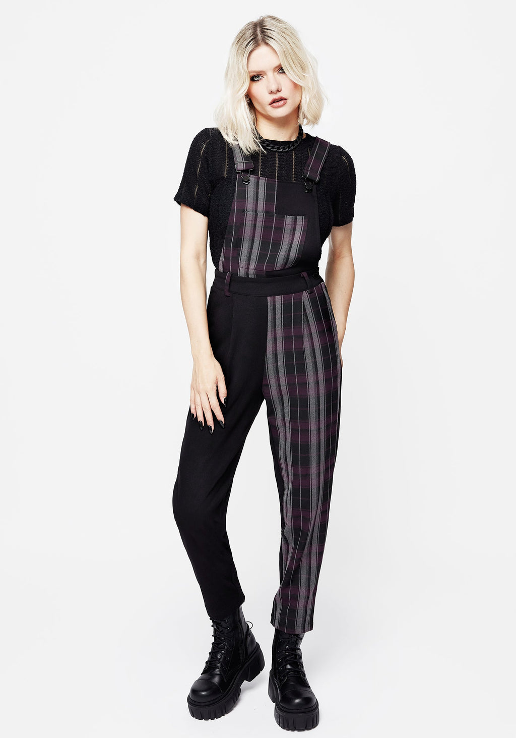 - Purple & grey spliced check dungarees