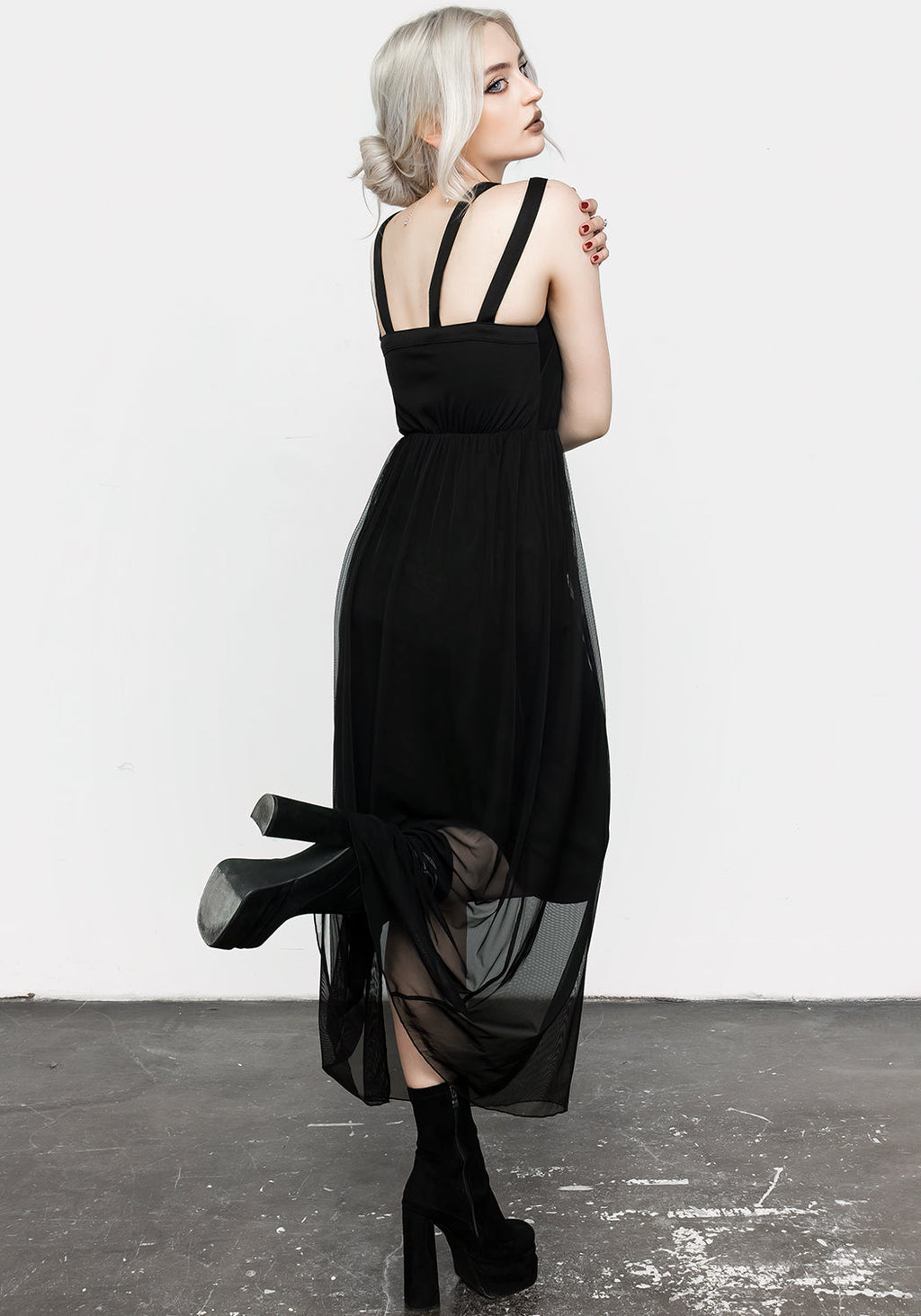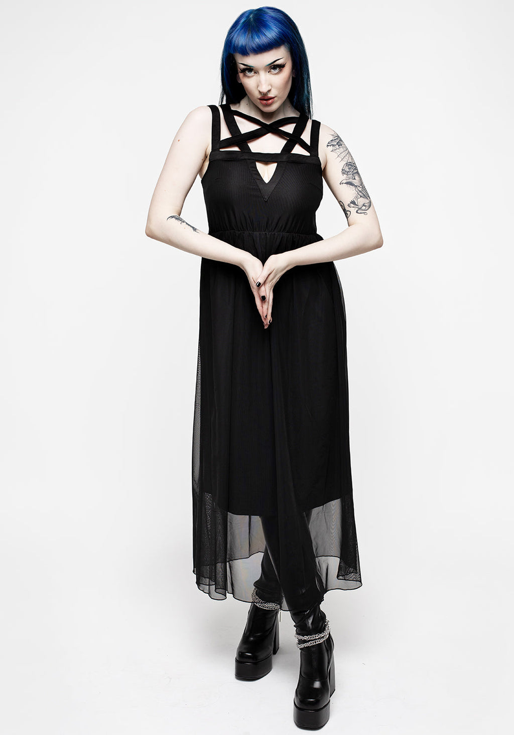 - Black mesh maxi dress with pentagram neckline