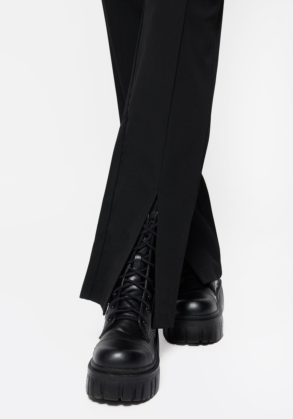 - Black straight leg tailored trousers with split cuff