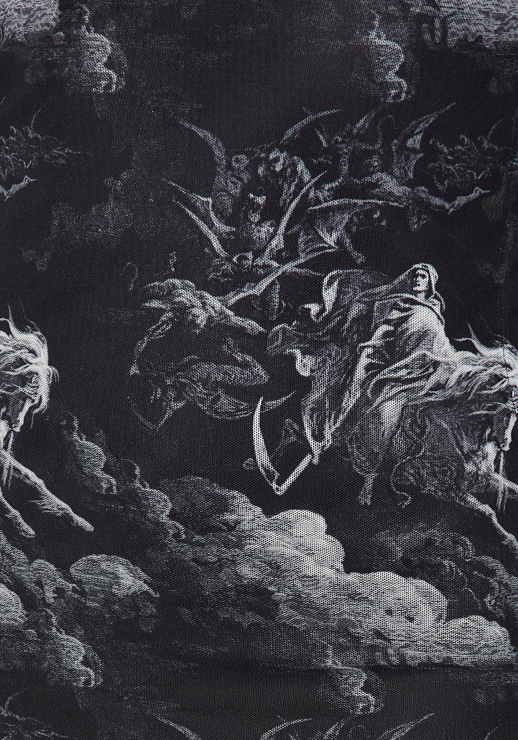 - Sheer black mesh fabrication with a macabre all-over print featuring Death on the Pale Horse