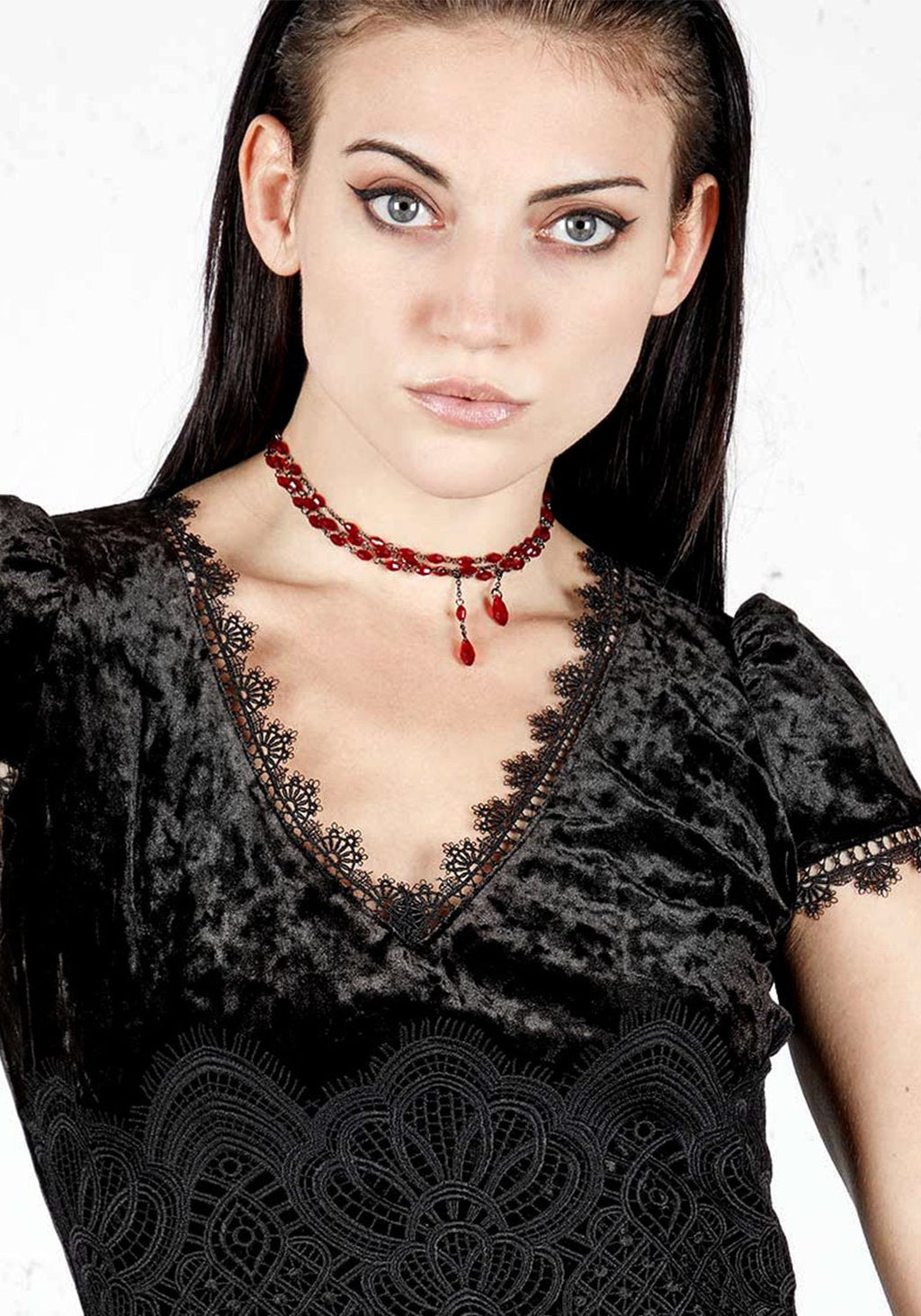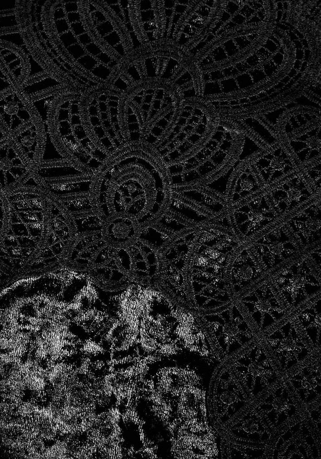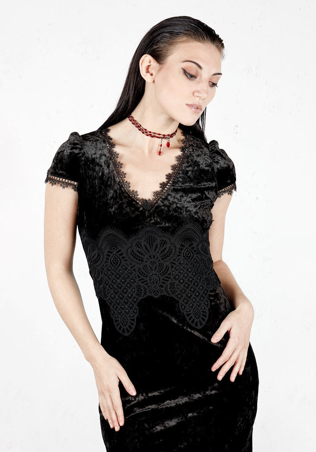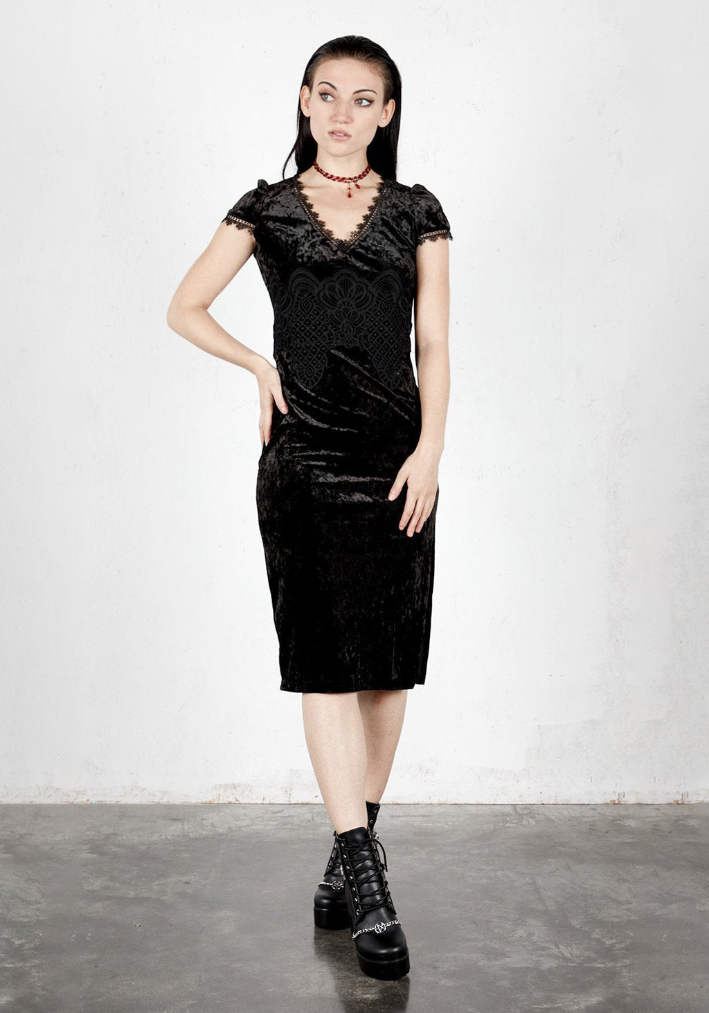 Retro inspired velvet wiggle dress with lace trims and waist panel detail.