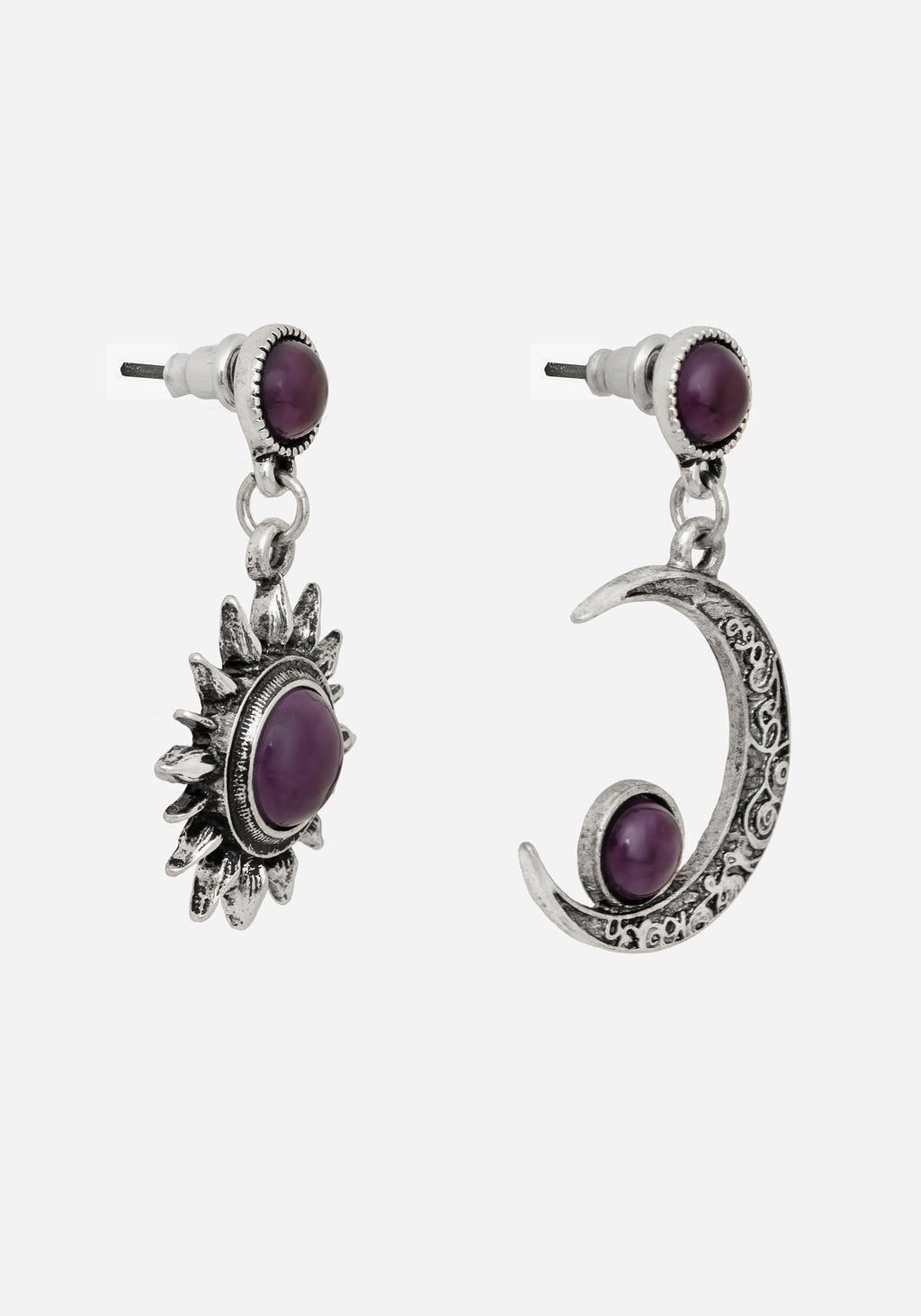 Asymmetrical silver-plated sun & moon drop earrings feature one moon & one sun pendant finished with rich purple gems.