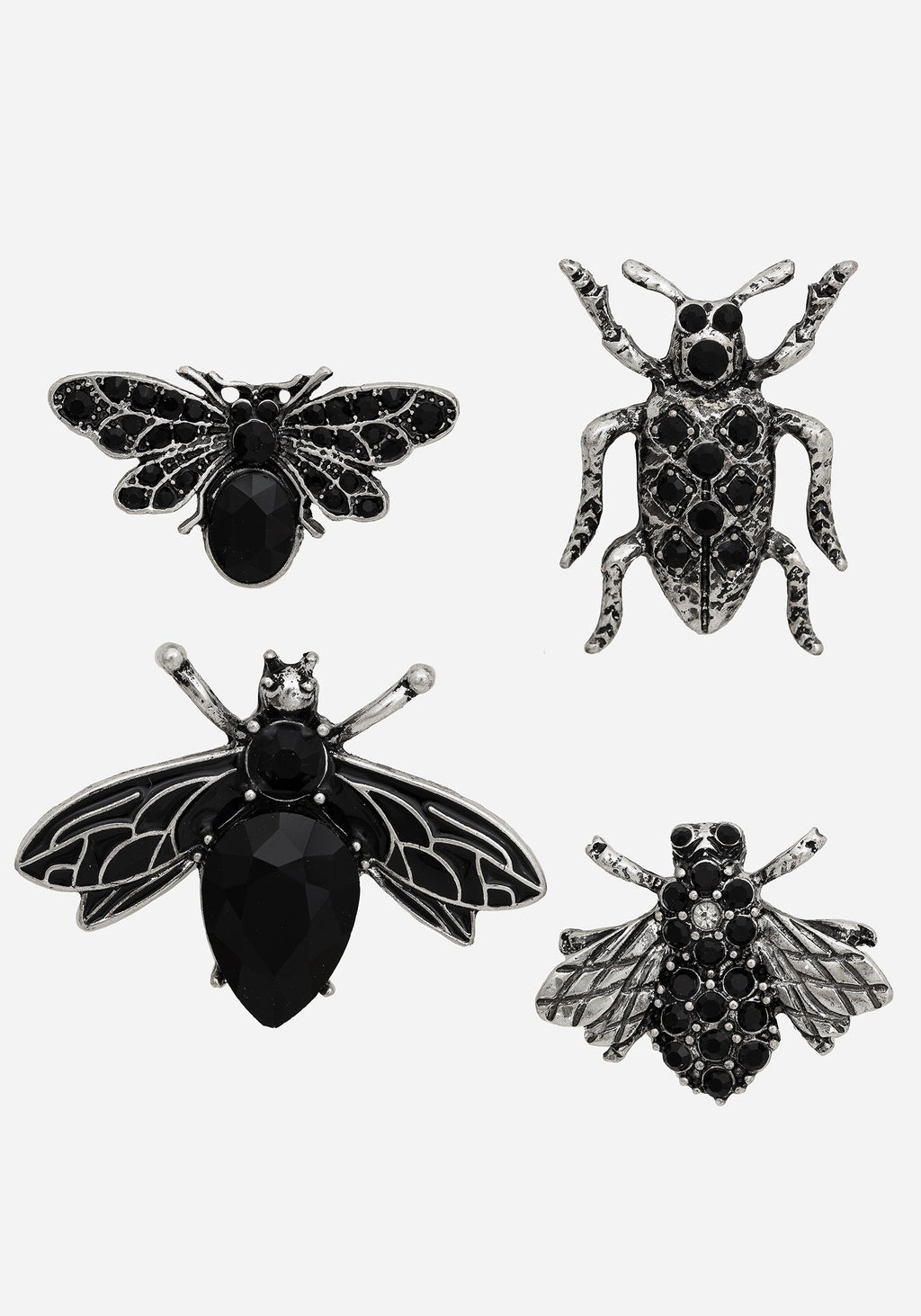 Justice for creepy crawlies. Here’s a set of four beetle pin brooches waiting to adorn lapels, collars, bags & more. Each is moulded silver metal, embellished with black gems & finished with a butterfly pin backing for easy attachment.
