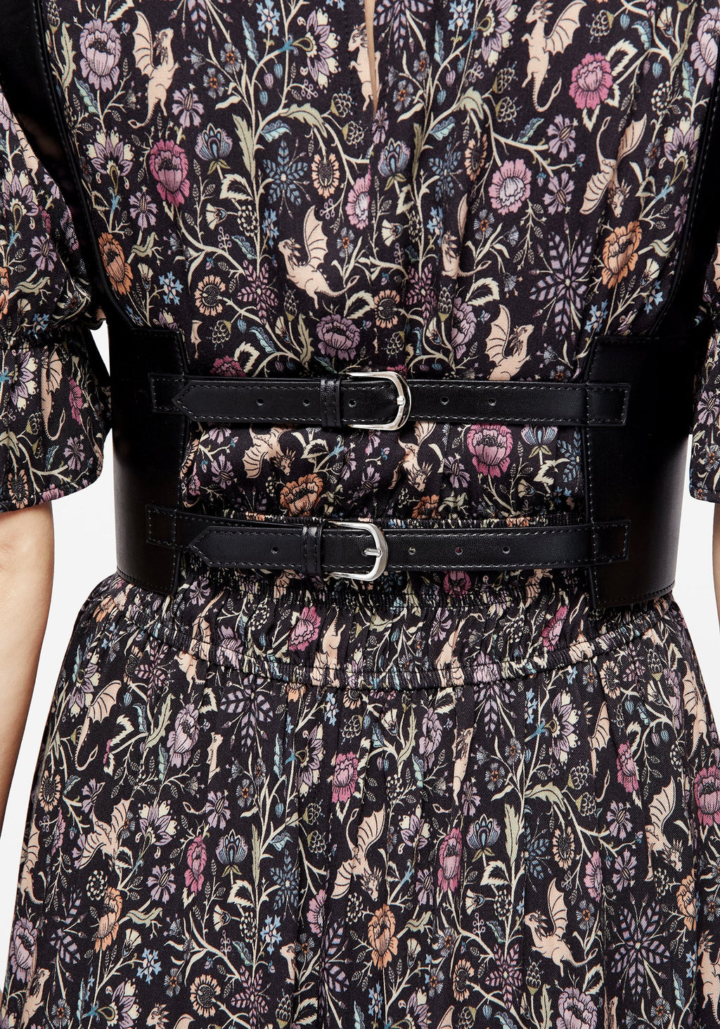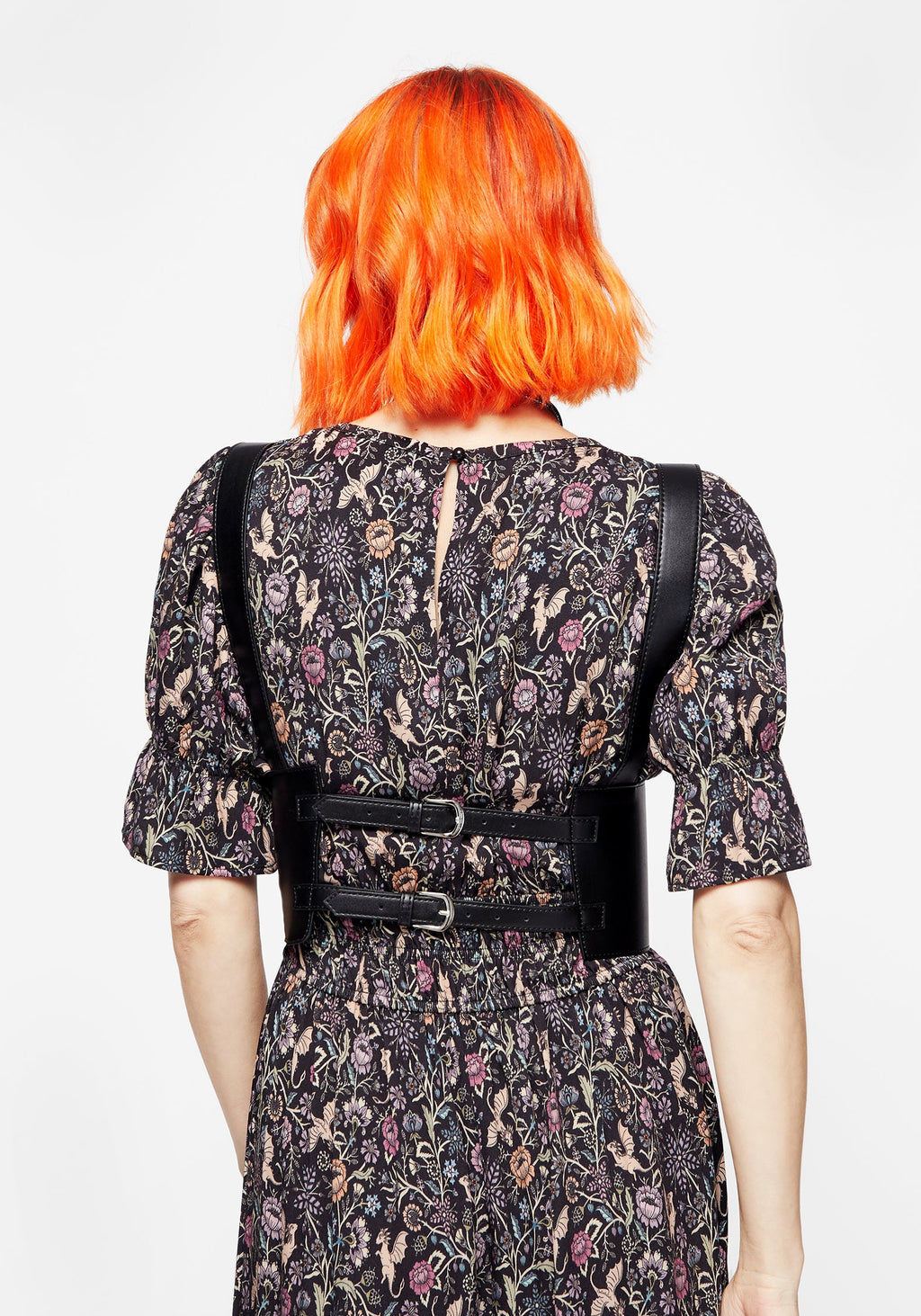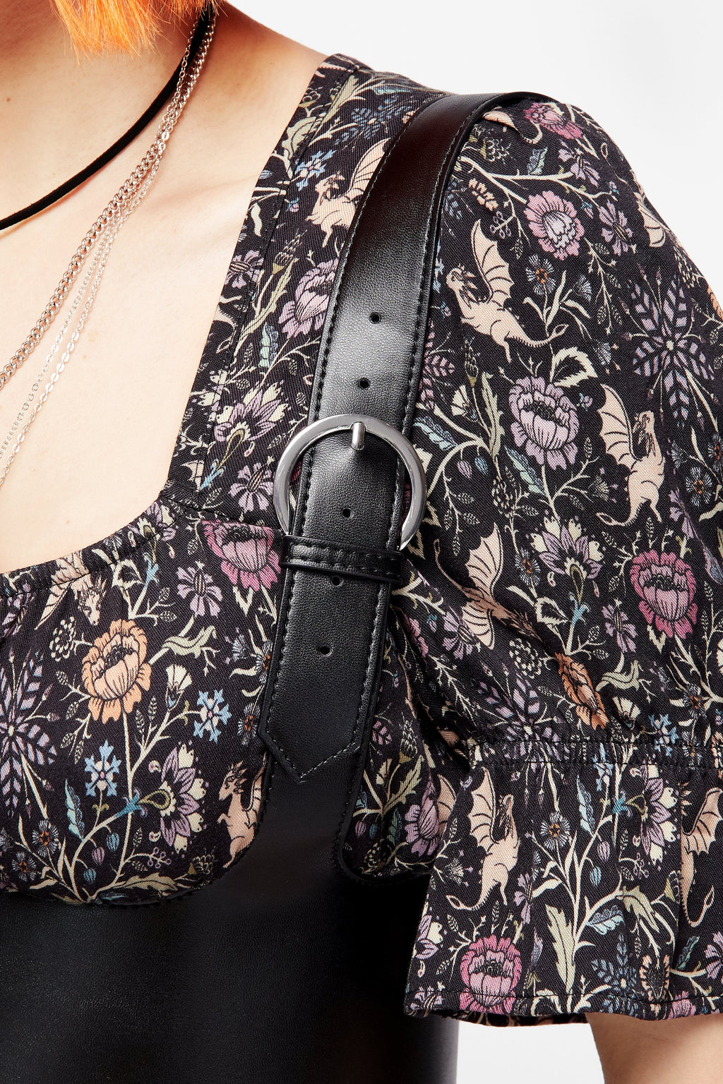 - Black faux leather lace-up underbust harness with silver hardware