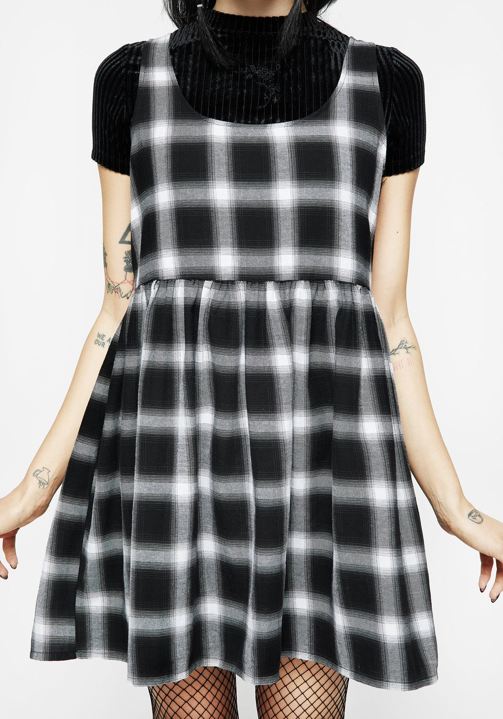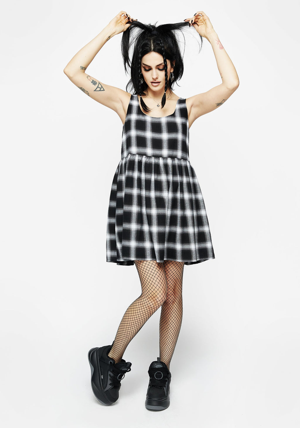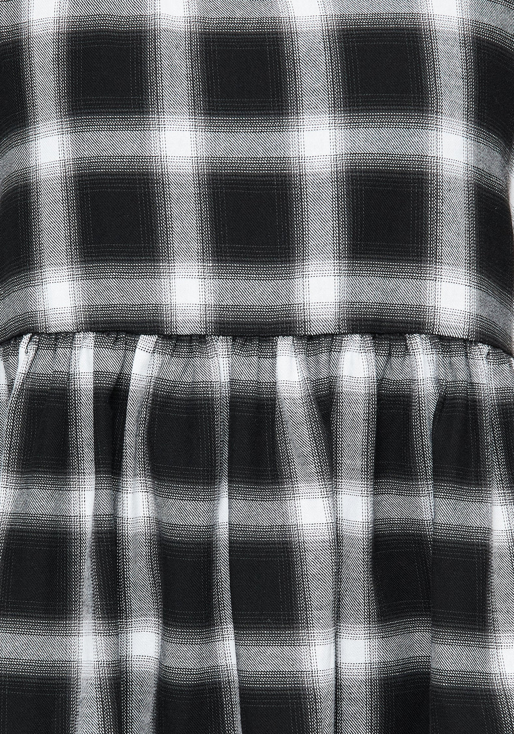 - All-over black, grey & white plaid print (softly diffused to transition between shades)