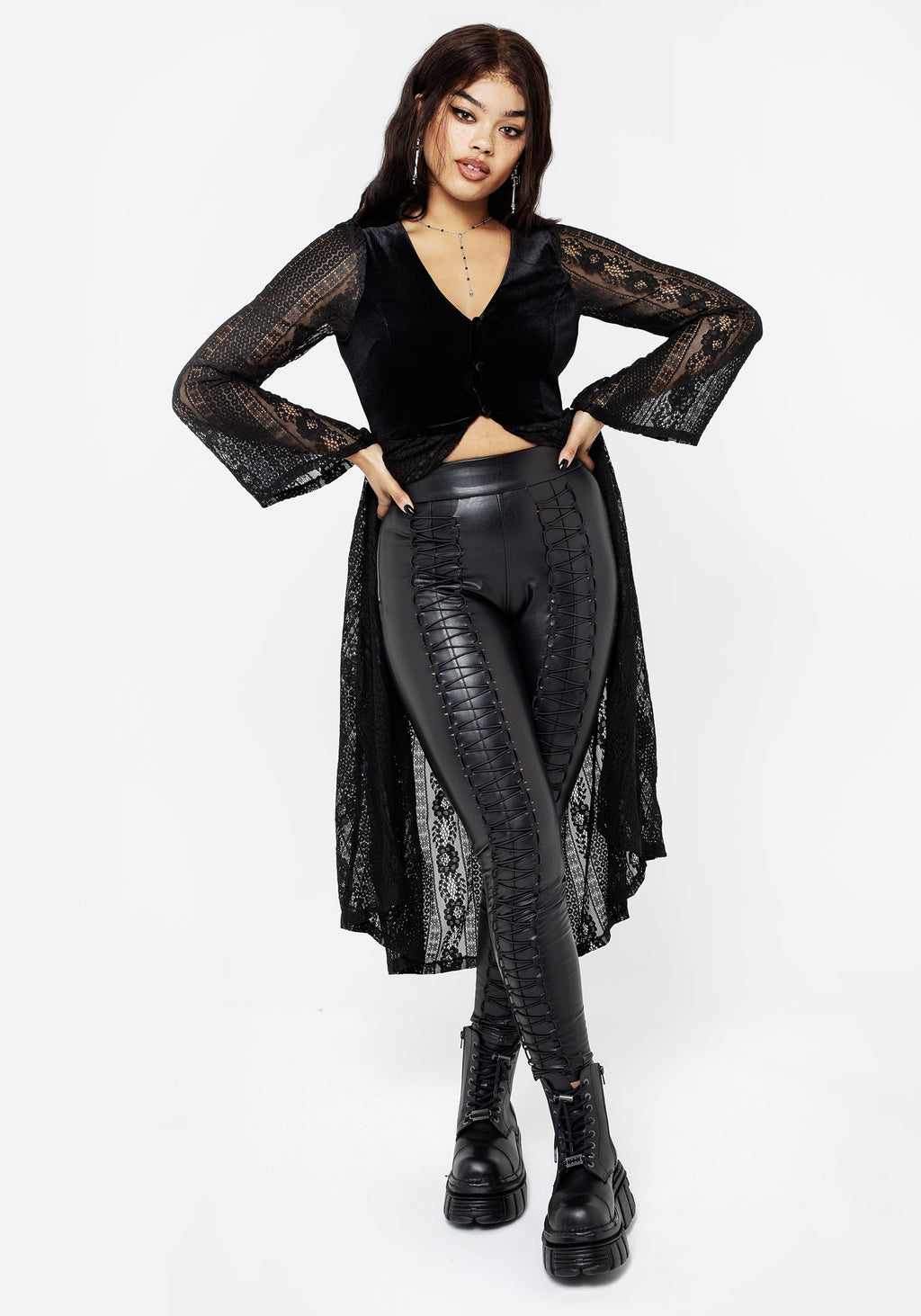 - Sultry V-neckline & dramatic sheer lace flared sleeves