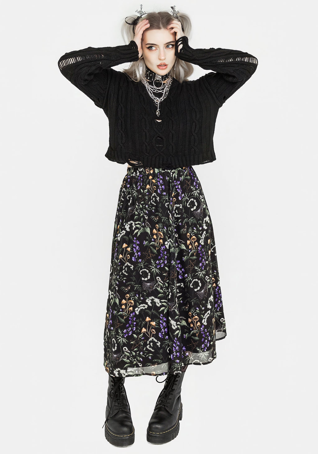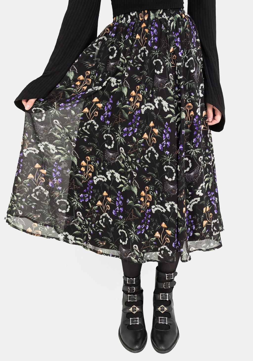 - Black floral print chiffon midi skirt
