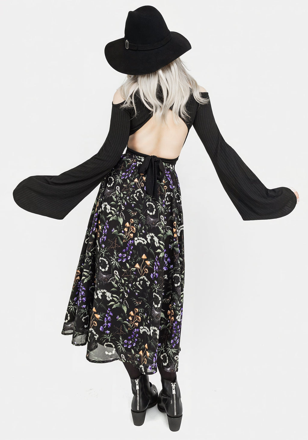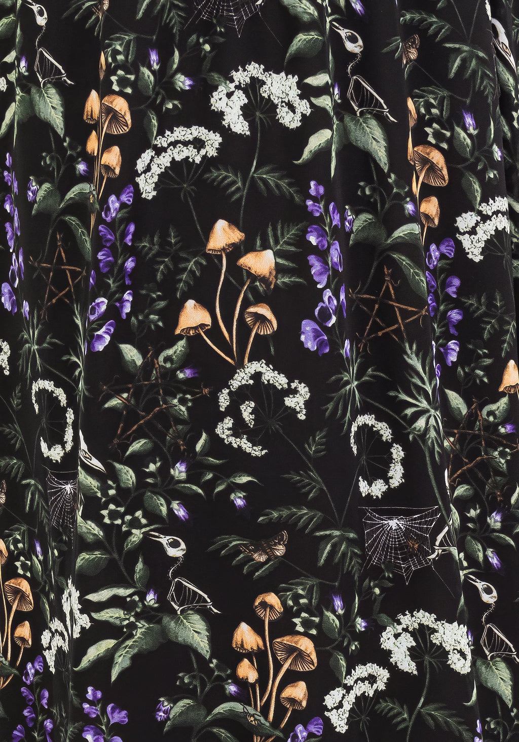 - Wicca-inspired forest print with witchy florals, skeletal creatures & dainty bugs entwined with wooden pentagrams on a black base