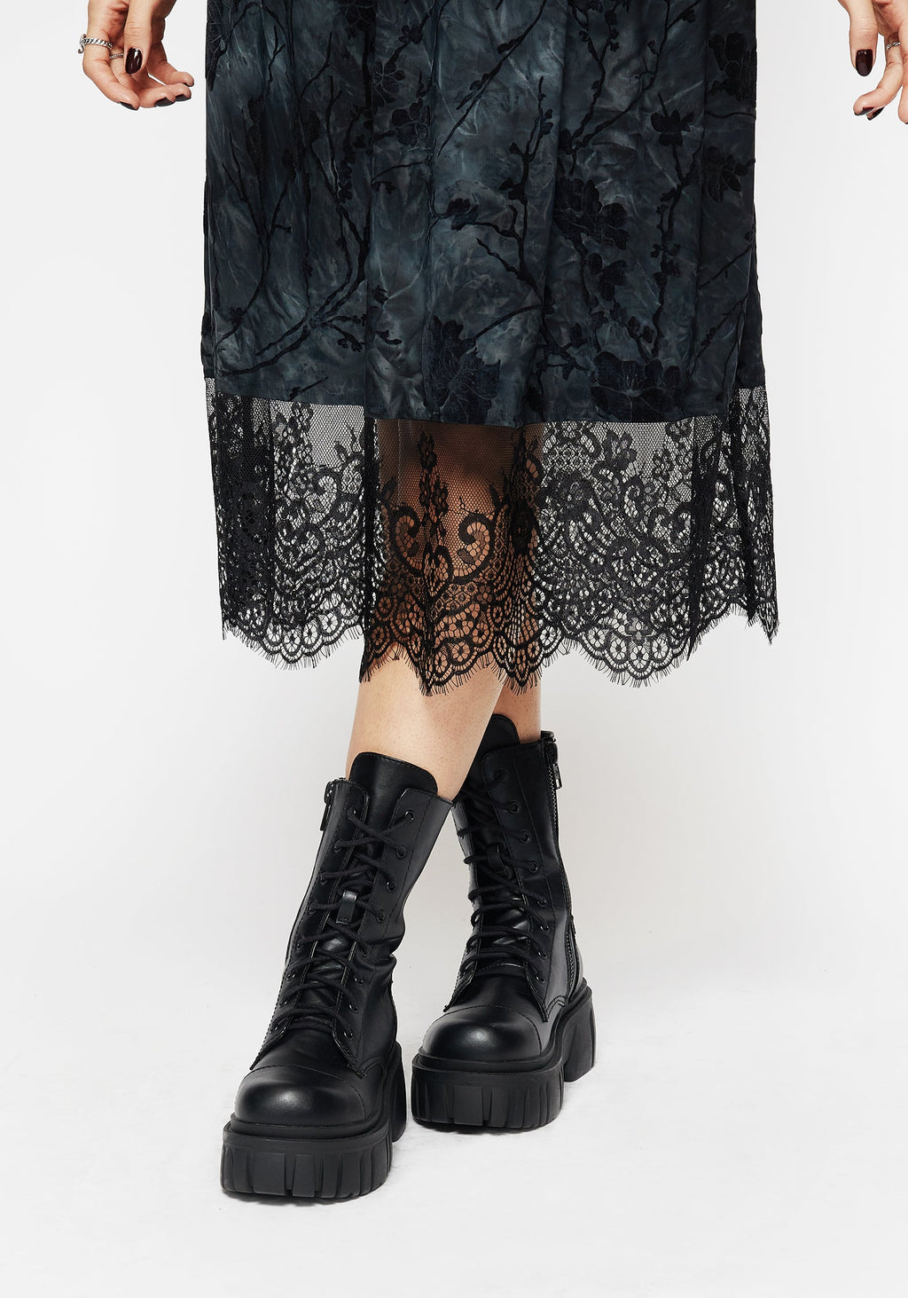 - Sultry lace-trimmed V-neckline & hem