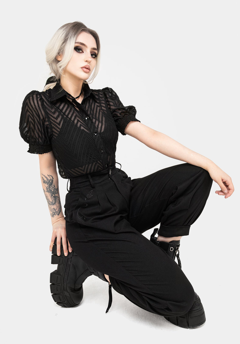- Crisp classic collar with sheer puff sleeves ending in elasticated cuffs