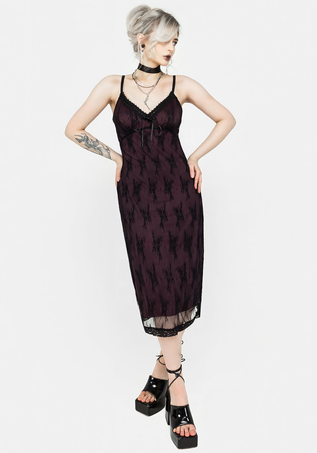- Purple & black lace cami midi dress