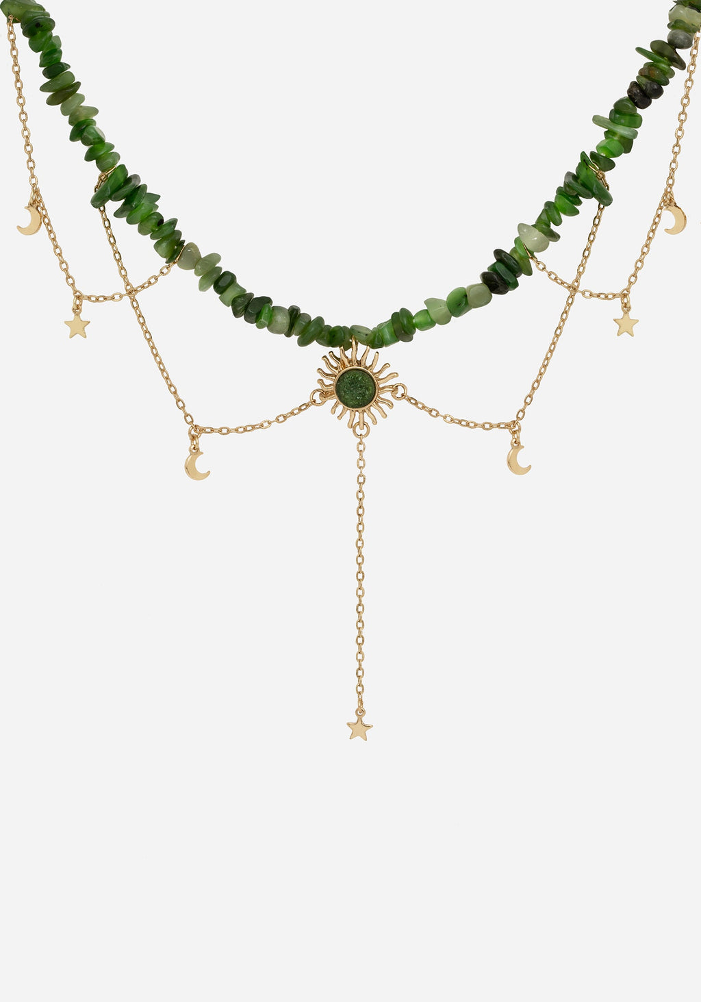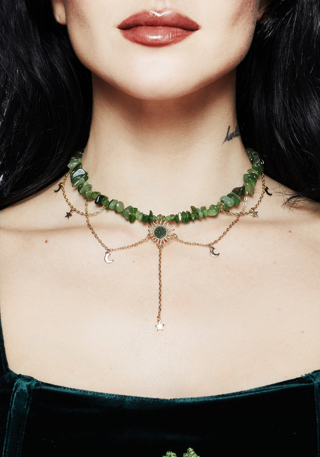 An ethereal, dimensional green gem choker necklace with a glistening golden sun pendant & decorated with delicate golden chains & dainty moon & star charms.