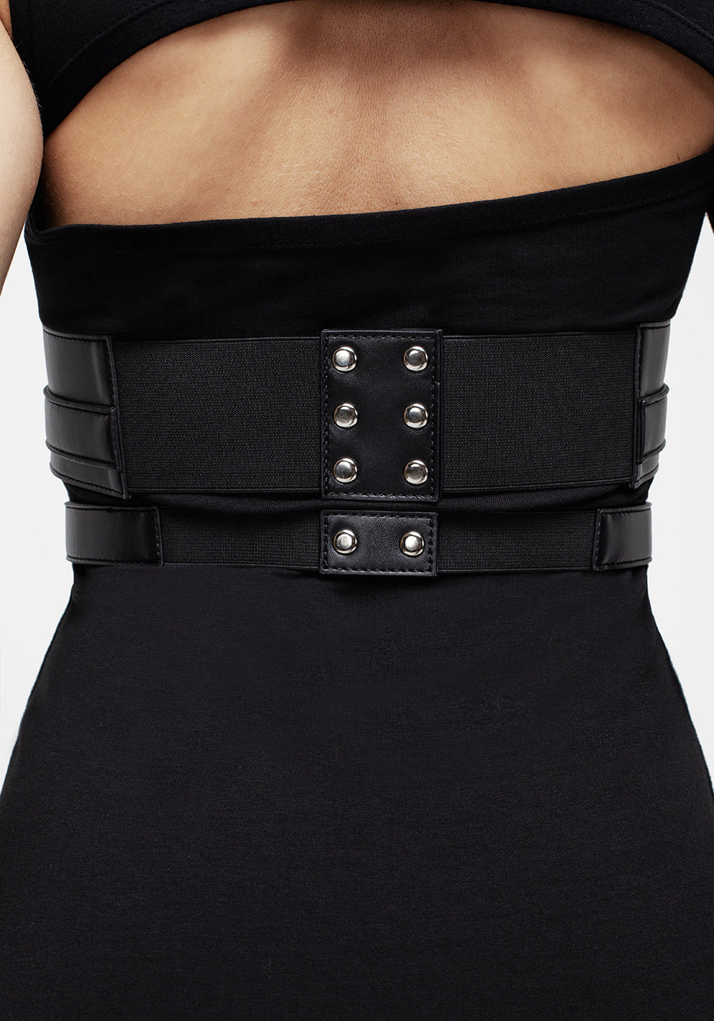 - Black faux leather layered underbust waist belt with silver hardware