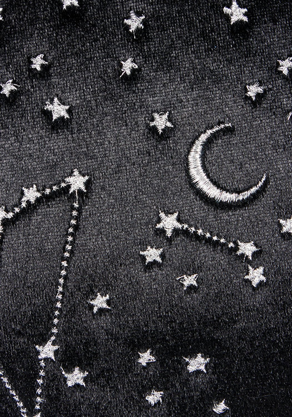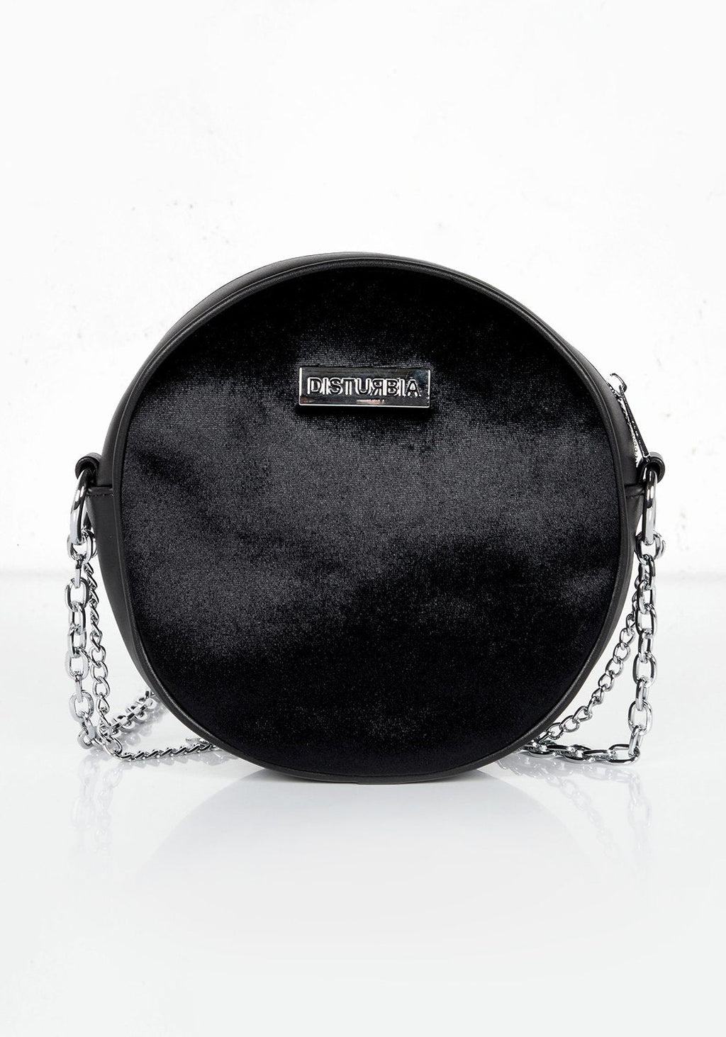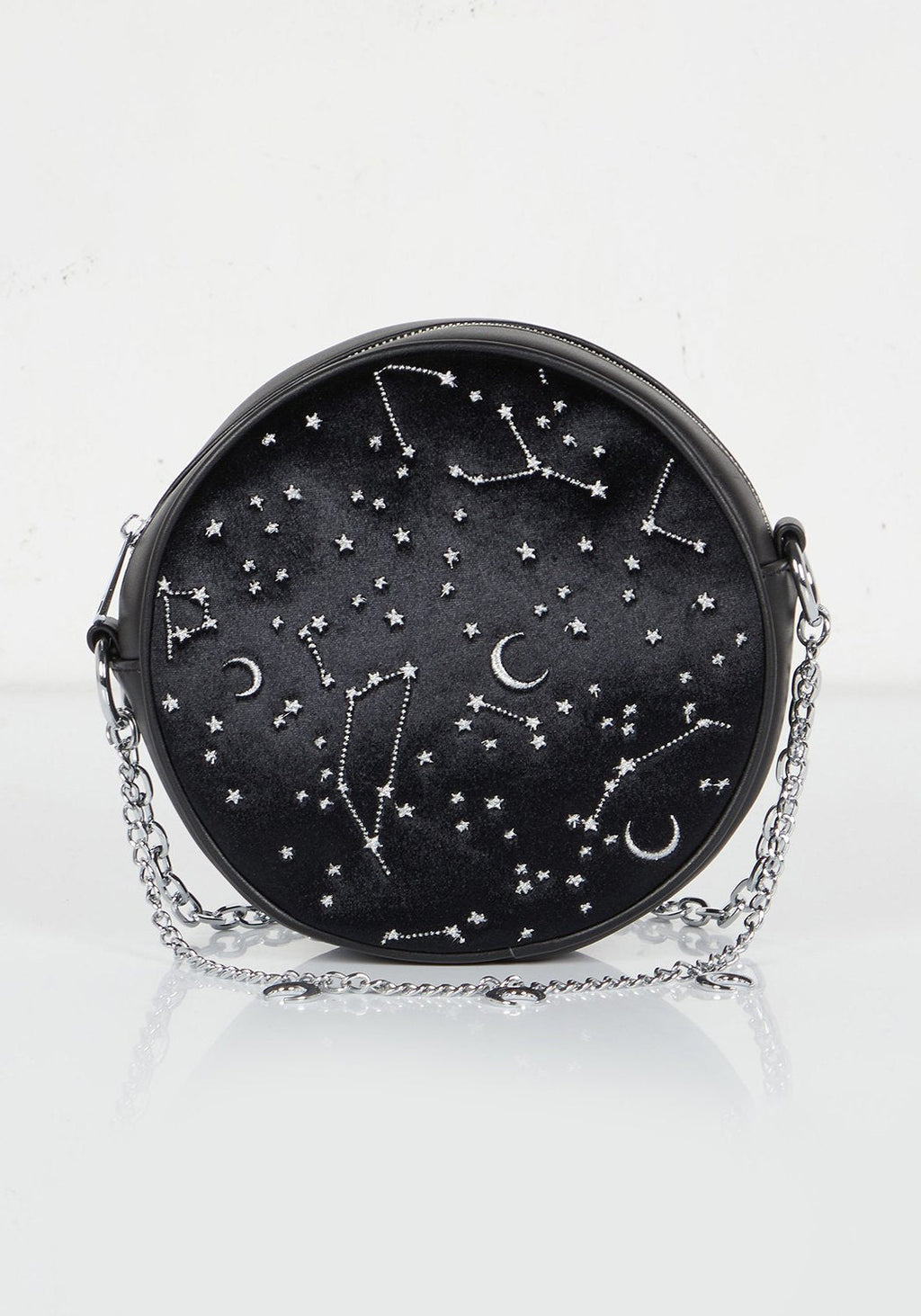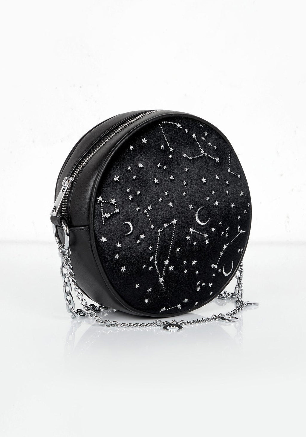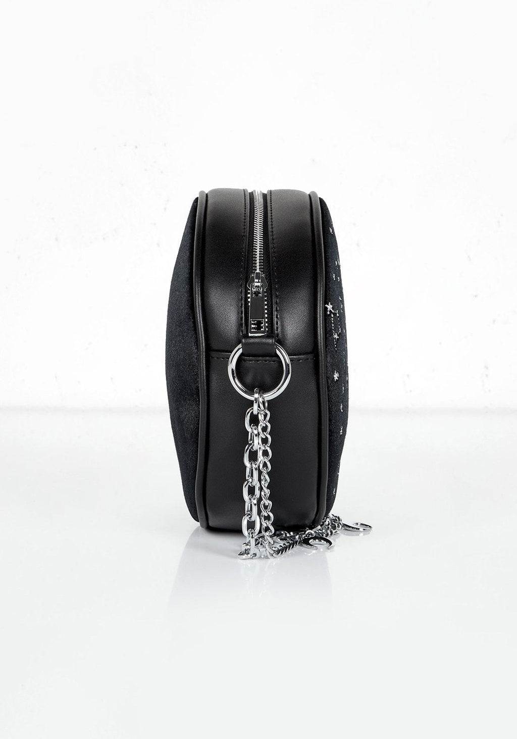 ✧ Round, embroidered shoulder bag with chains & moon charms