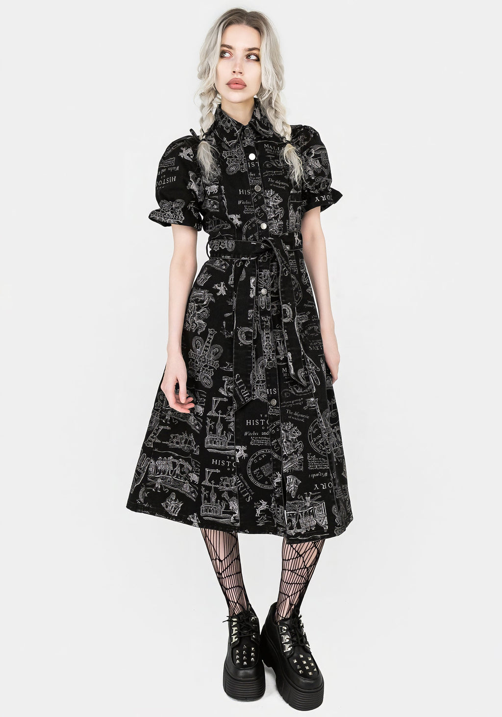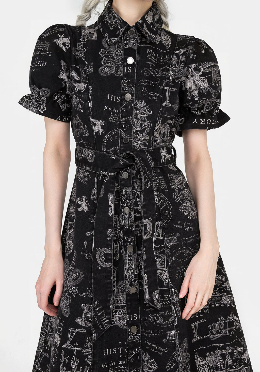 - Black denim witchcraft print midi shirt dress
